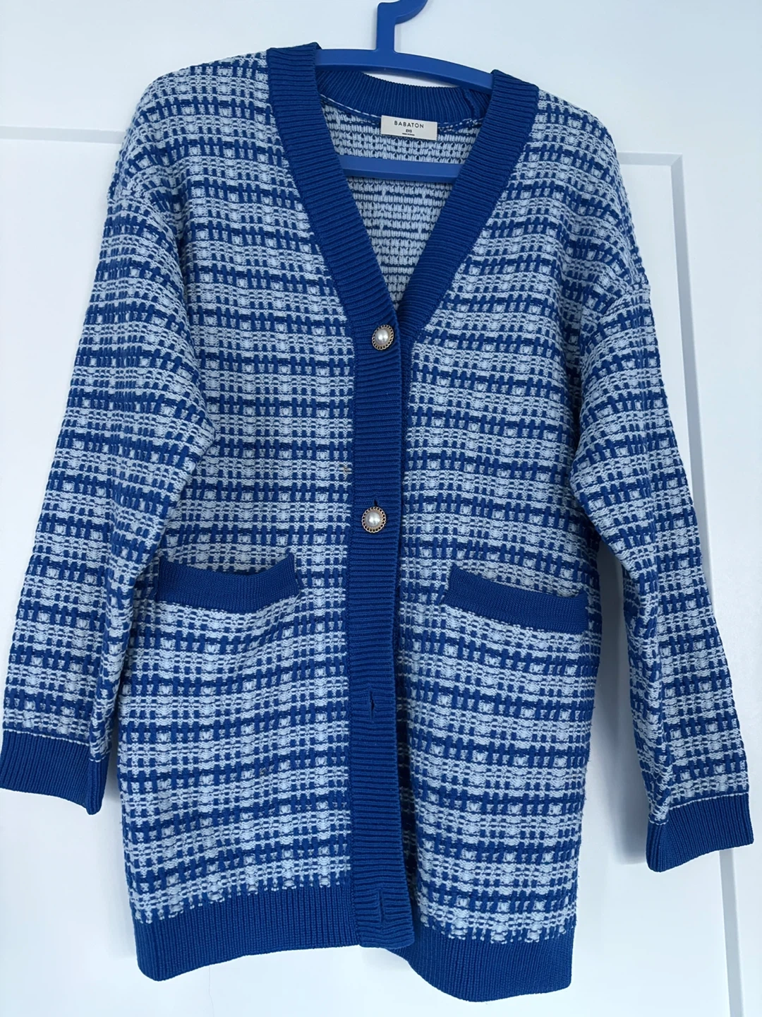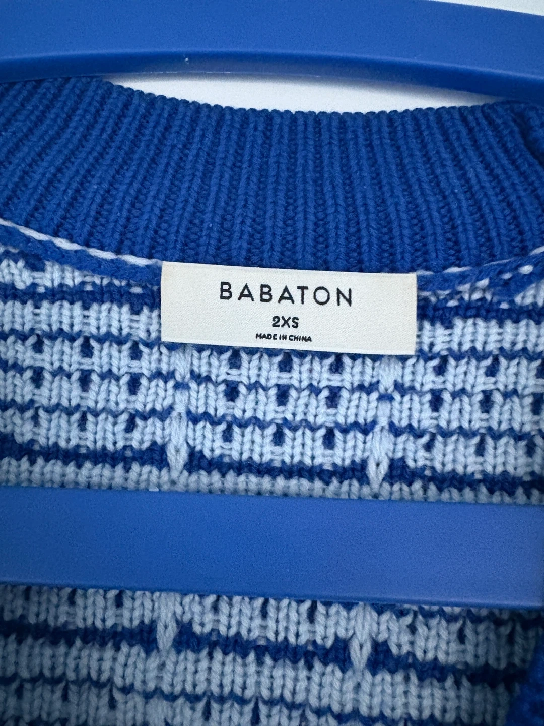 Selling a Babaton cardigan in a beautiful blue and white pattern. It's a size 2XS and in great condition. Perfect for layering or wearing on its own!