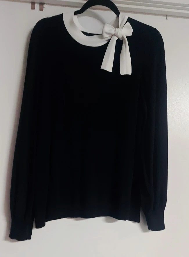 A cute black and white sweater with a bow detail! The material is a blend of 79% viscose and 21% nylon, making it comfy and easy to care for. Perfect for adding a touch of elegance to your wardrobe