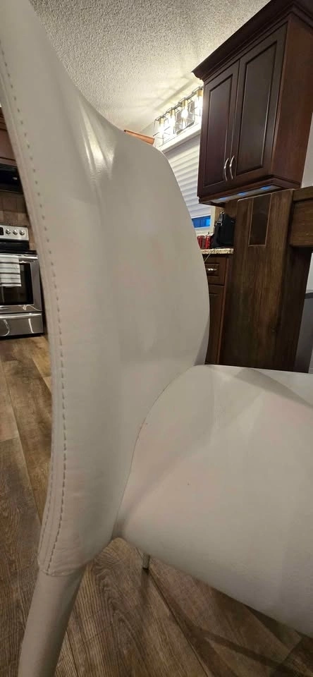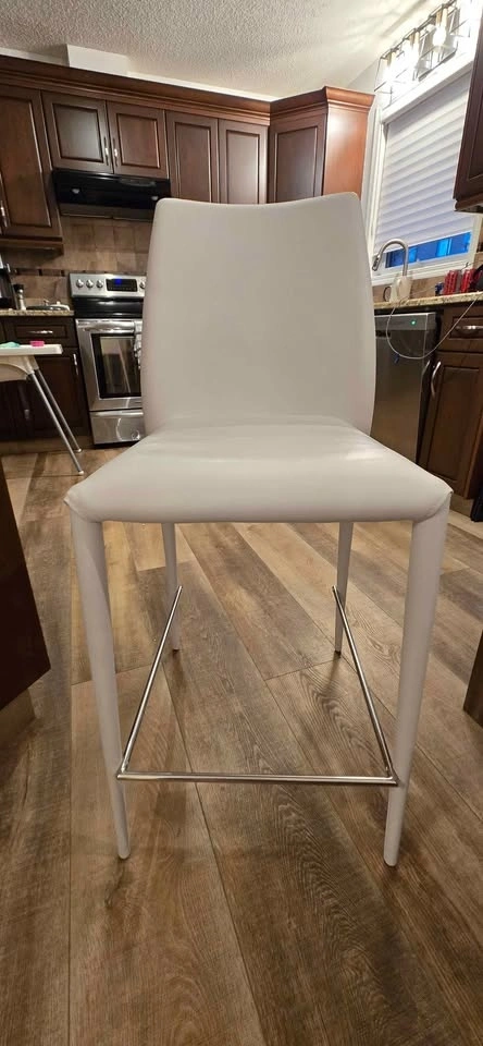 Beautiful seven piece Structube high top kitchen set. Includes six artisan leather-look white high top chairs all in perfect shape.