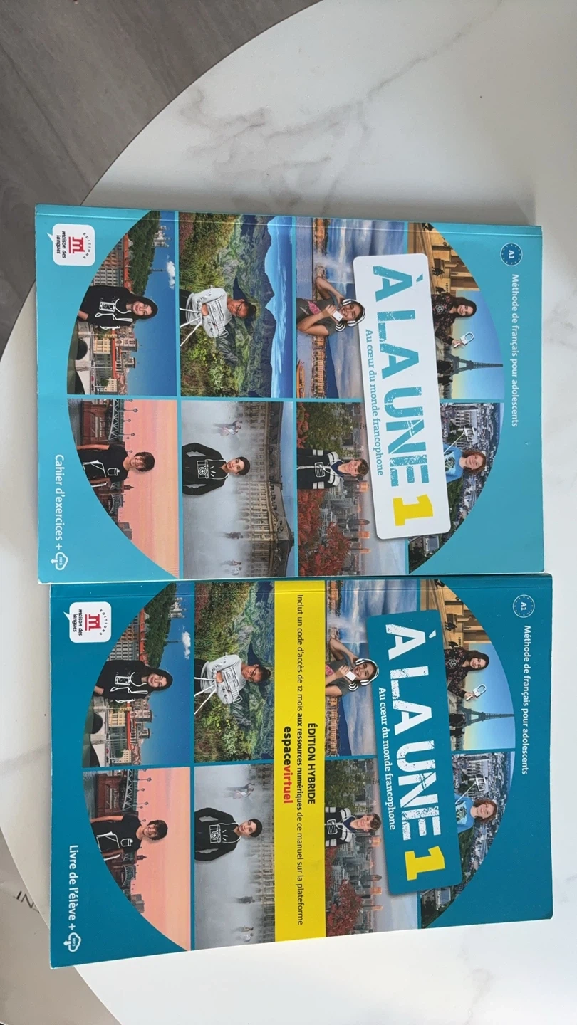 Selling a set of French language learning materials, including the textbook and workbook for 'À LA UNE 1'. These are great for adolescents learning French, with a focus on the francophone world. The hybrid edition includes access to digital resources on the espacevirtuel platform for 12 months. Perfect for students!