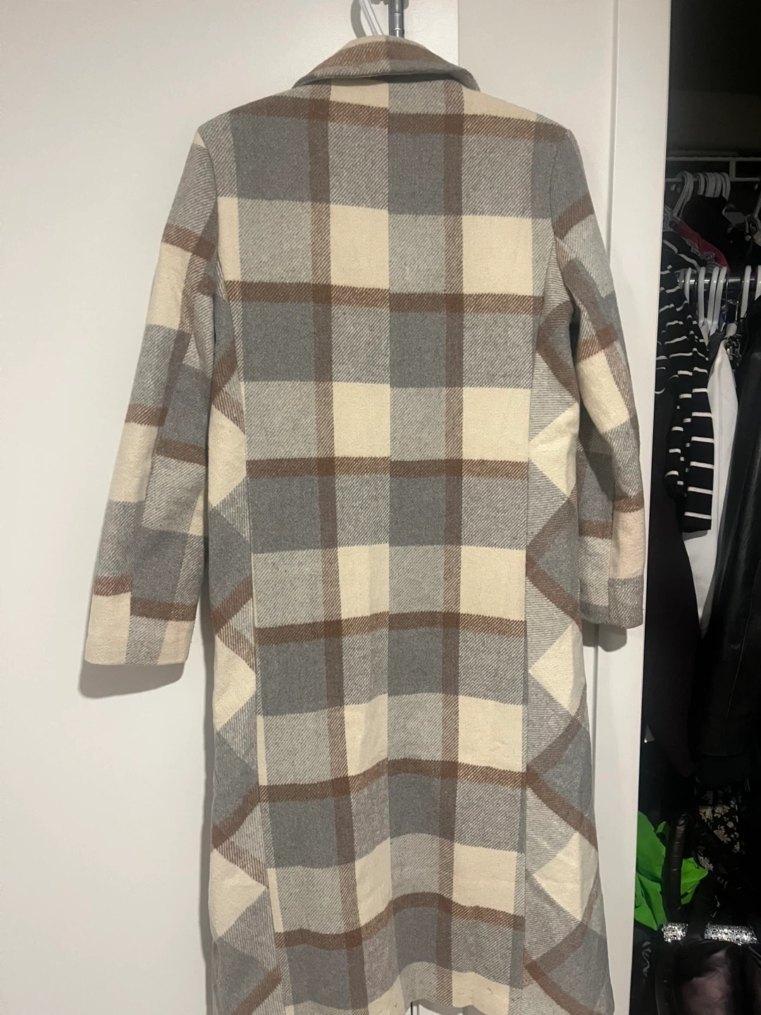 Cozy plaid coat, perfect for fall! The neutral tones make it easy to match with any outfit. It's a wool blend so it's sure to keep you warm on those chilly days