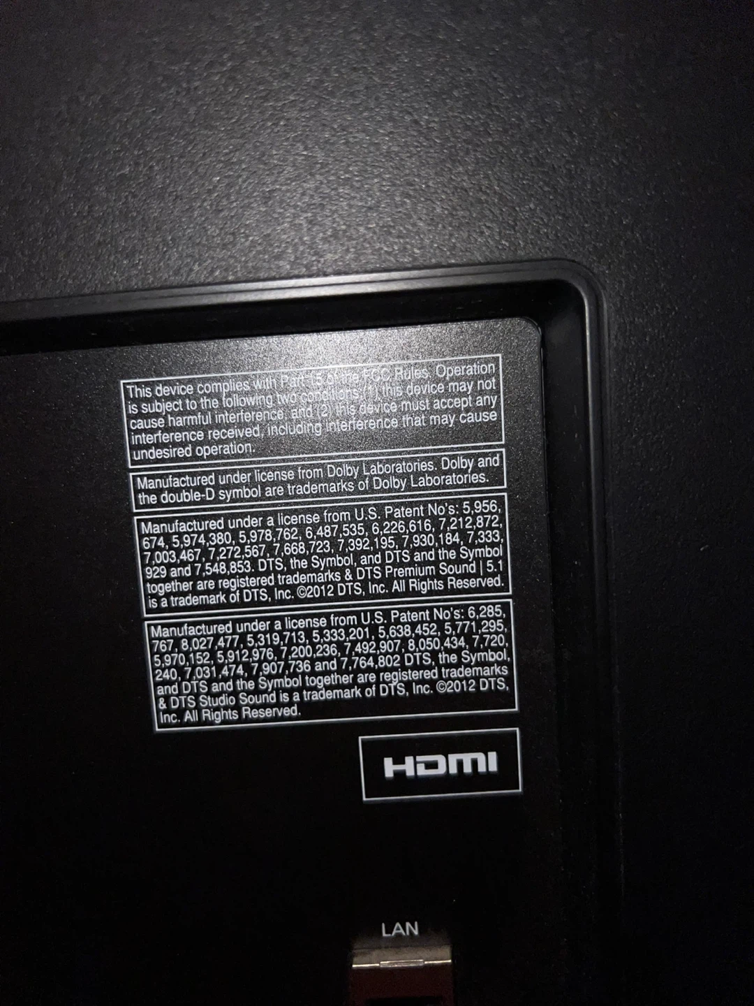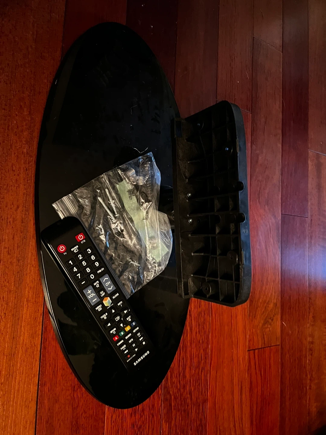Samsung LCD TV. It measures approximately 40 inches across. There are multiple ports in the back, including HDMI and USB. Includes stand and remote control. Can also be wall mounted.