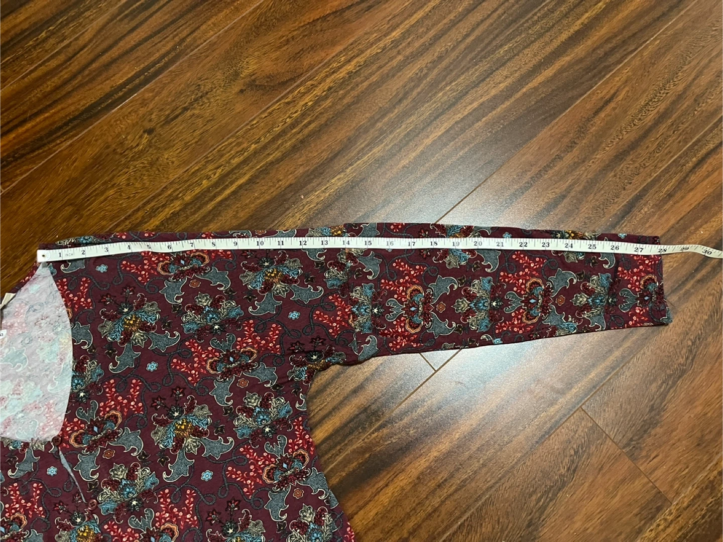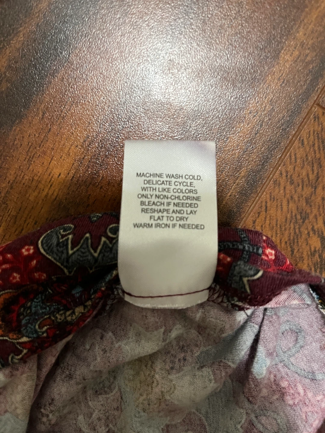 Alkamy women’s size medium long sleeve paisley top in a deep burgundy tone with multicolour detailing. Button-down front with elastic-loop buttons, V-neck and tie-front hem. Soft 95% rayon 5% spandex for a flattering drape.