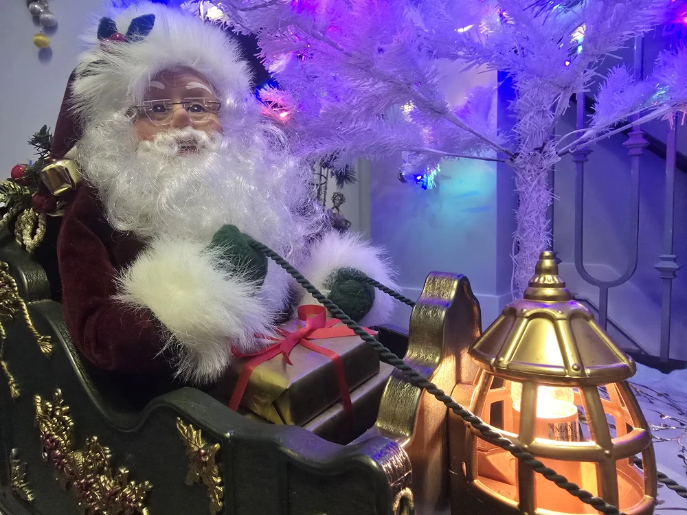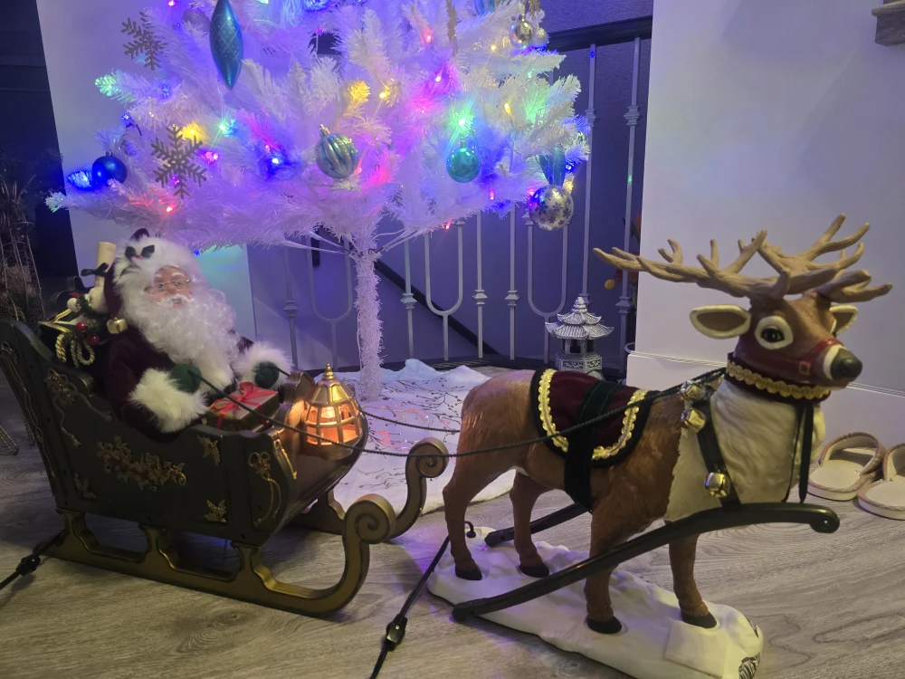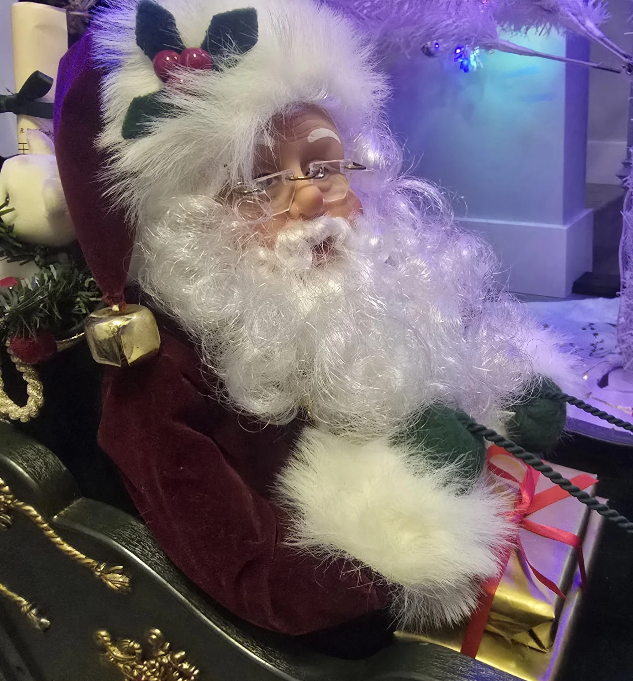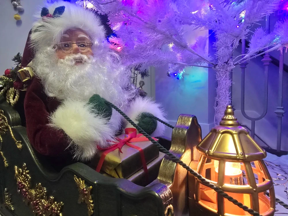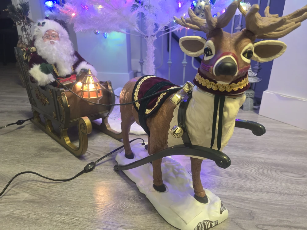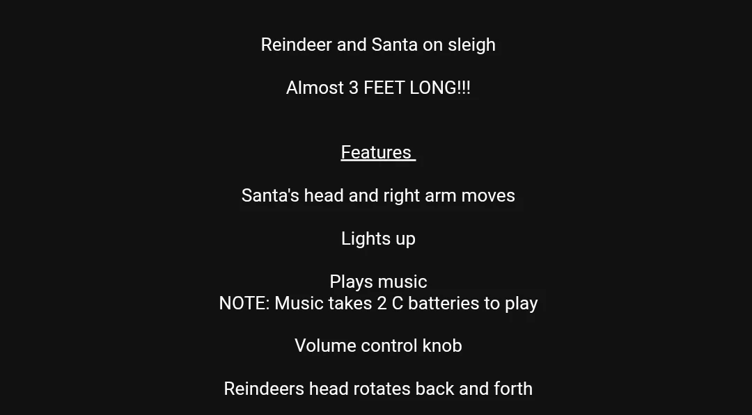 Get ready for the holidays with this charming animated Santa and reindeer sleigh! It's almost 3 feet long and features Santa's head and arm moving, along with a reindeer head that rotates. It lights up and plays music, with a volume control knob. Please note that the music requires 2 C batteries to play.