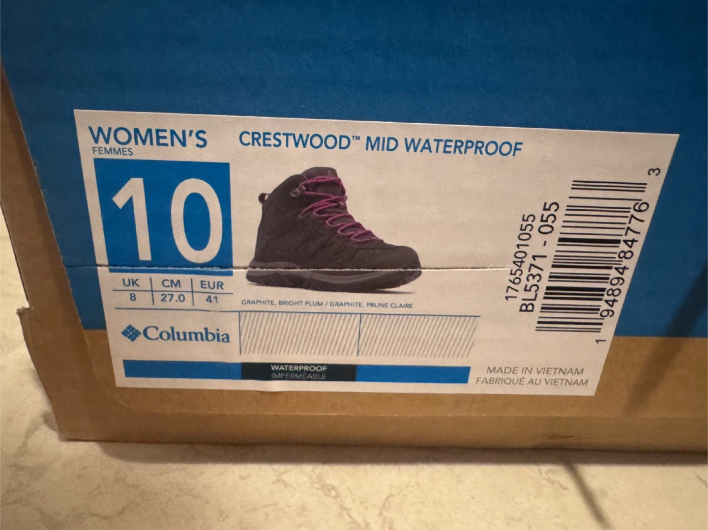 Selling a pair of Columbia Crestwood Mid Waterproof boots size 10. These are brand new and come with the original box! The colour is a stylish graphite, bright plum, and prune claire combo. They are waterproof and breathable, perfect for any weather!