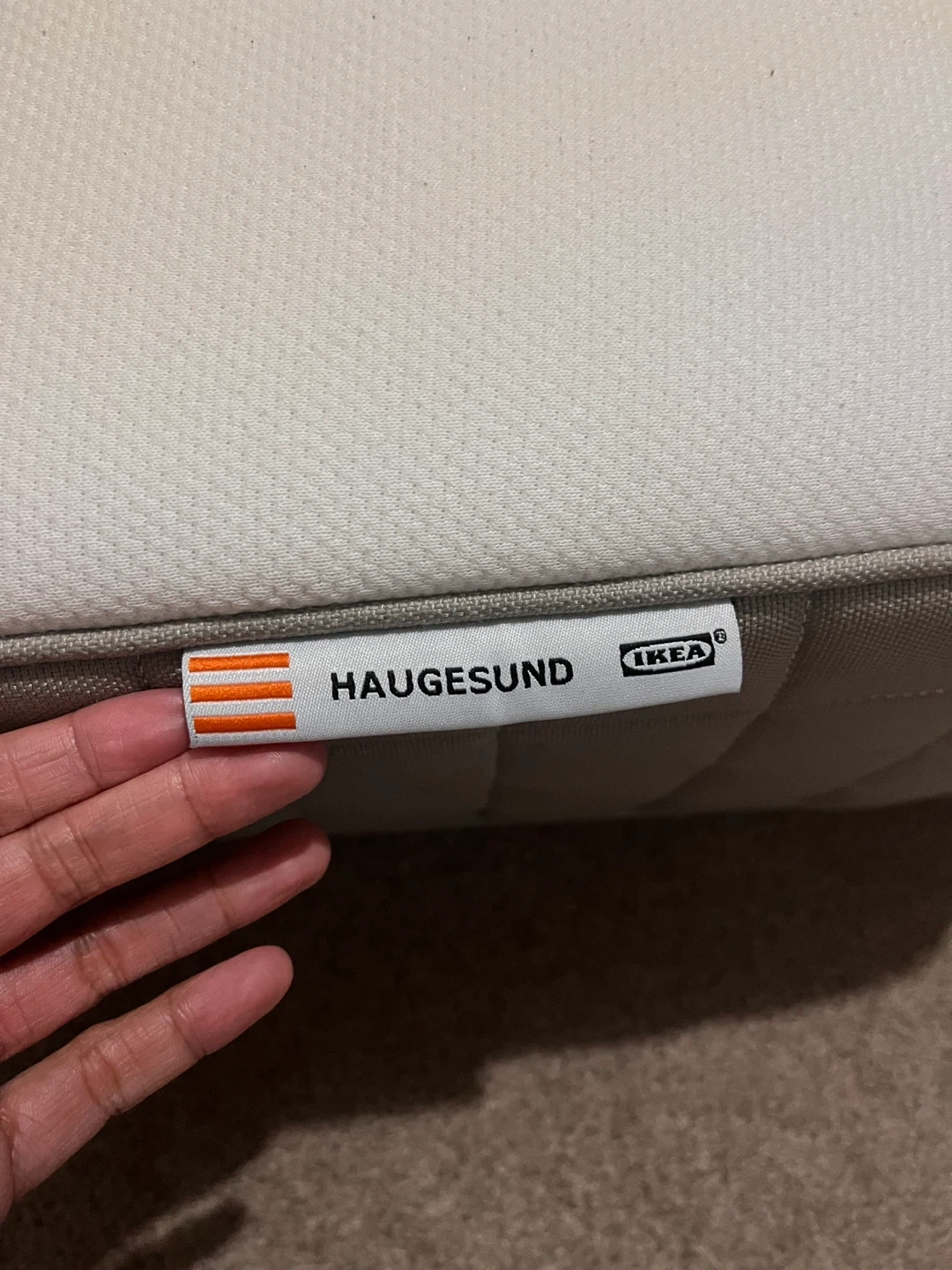 Selling an IKEA Haugesund mattress. The label indicates it contains new material only, including polyurethane foam, polyester fiber, an inner spring unit, and steel. The federal requirement lists 52% polyester and 48% cotton