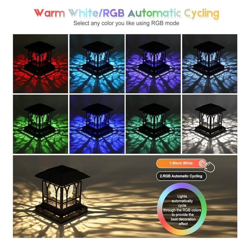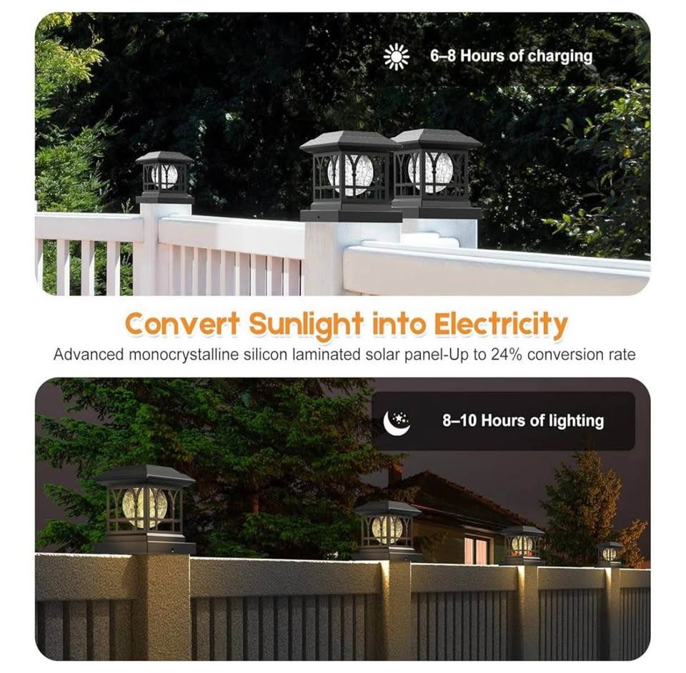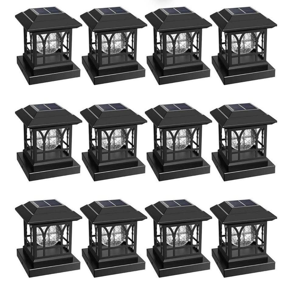 Brand new 12-pack of AEYANZZ Solar Fence Post Lights with crackle-glass design. Features Warm White & RGB lighting with 2 automatic cycling modes. Brightness: 20 lumens. Fits post sizes: 3.6×3.6, 4×4, 4.5×4.5, 5×5 (vinyl or wooden). Black color. Ideal for fences, decks, patios, and pathways.