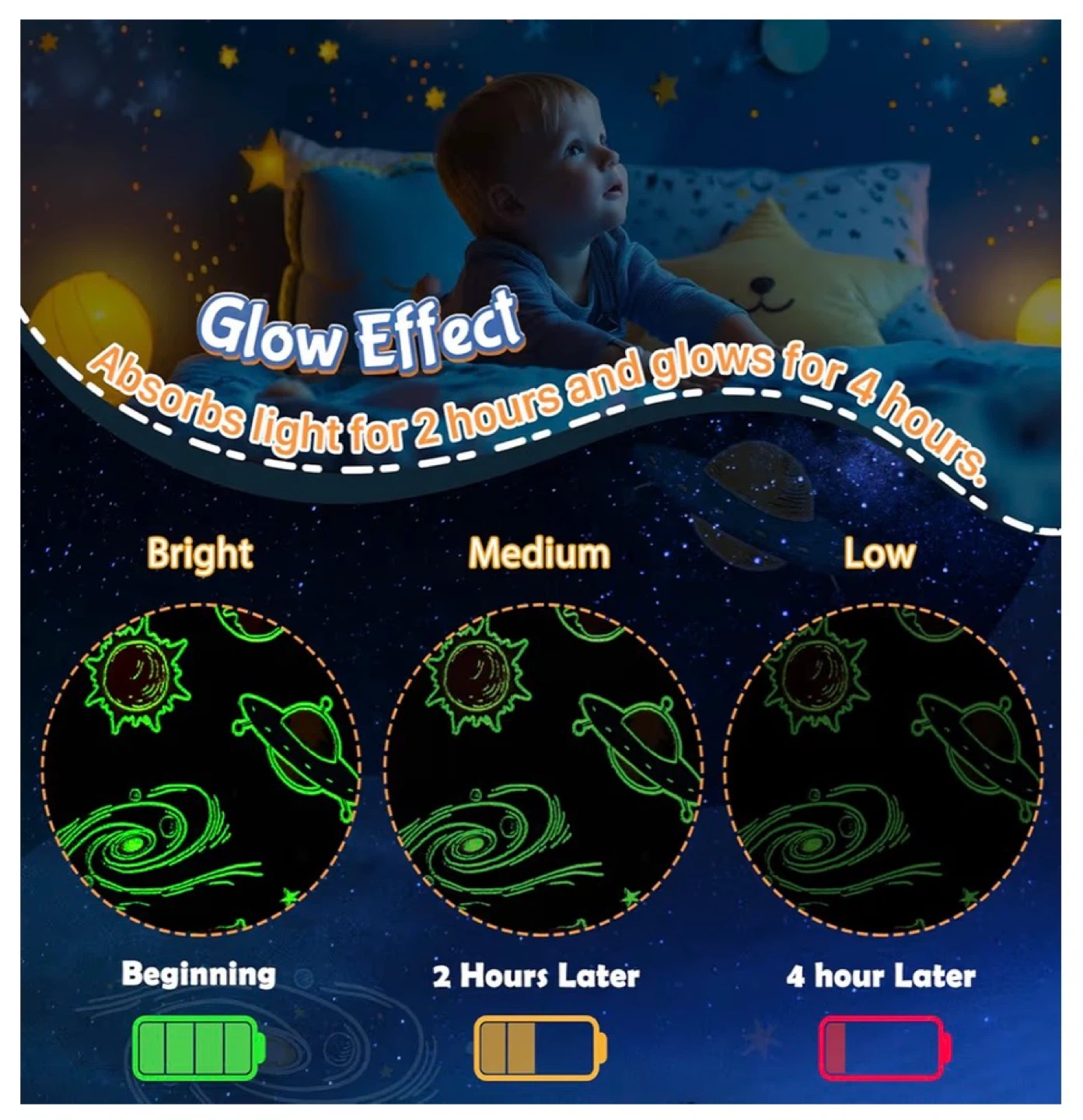 Snuggle up with this New glow-in-the-dark galaxy space blanket! It's perfect for adding a bit of fun to bedtime. The blanket absorbs light for 2 hours and glows for 4 hours, making it a super cool addition to any room. It's decorated with planets, stars, and spaceships, and is great for both kids and adults it’s $45 on Amazon.