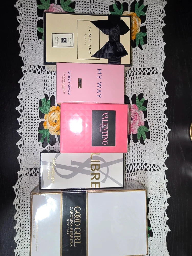 Selling a designer perfumes. All are in their original boxes! Jo Malone, Giorgio Armani (My Way, Acqua di Gio, Oud Royal), Valentino, Yves Saint Laurent (Libre), and Carolina Herrera (Good Girl). ( price for each piece)