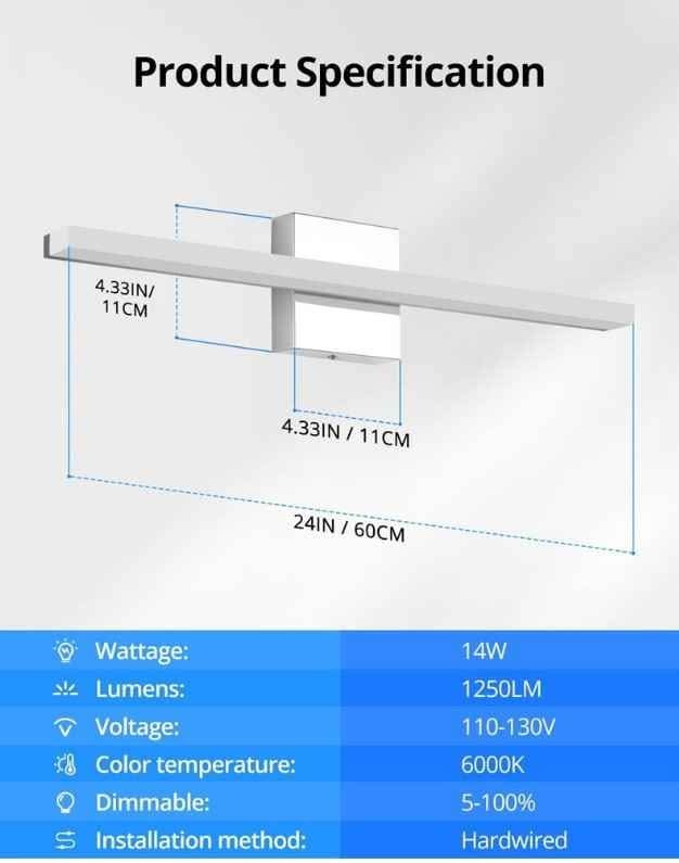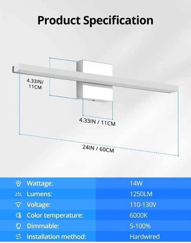Bright dimmable LED light fixture with a modern design and white finish. It's 24 inches long and 4.33 inches wide, with a wattage of 14W and a lumen output of 1250LM. Hardwired with a voltage range of 110-130V and dimmable from 5-100%.
