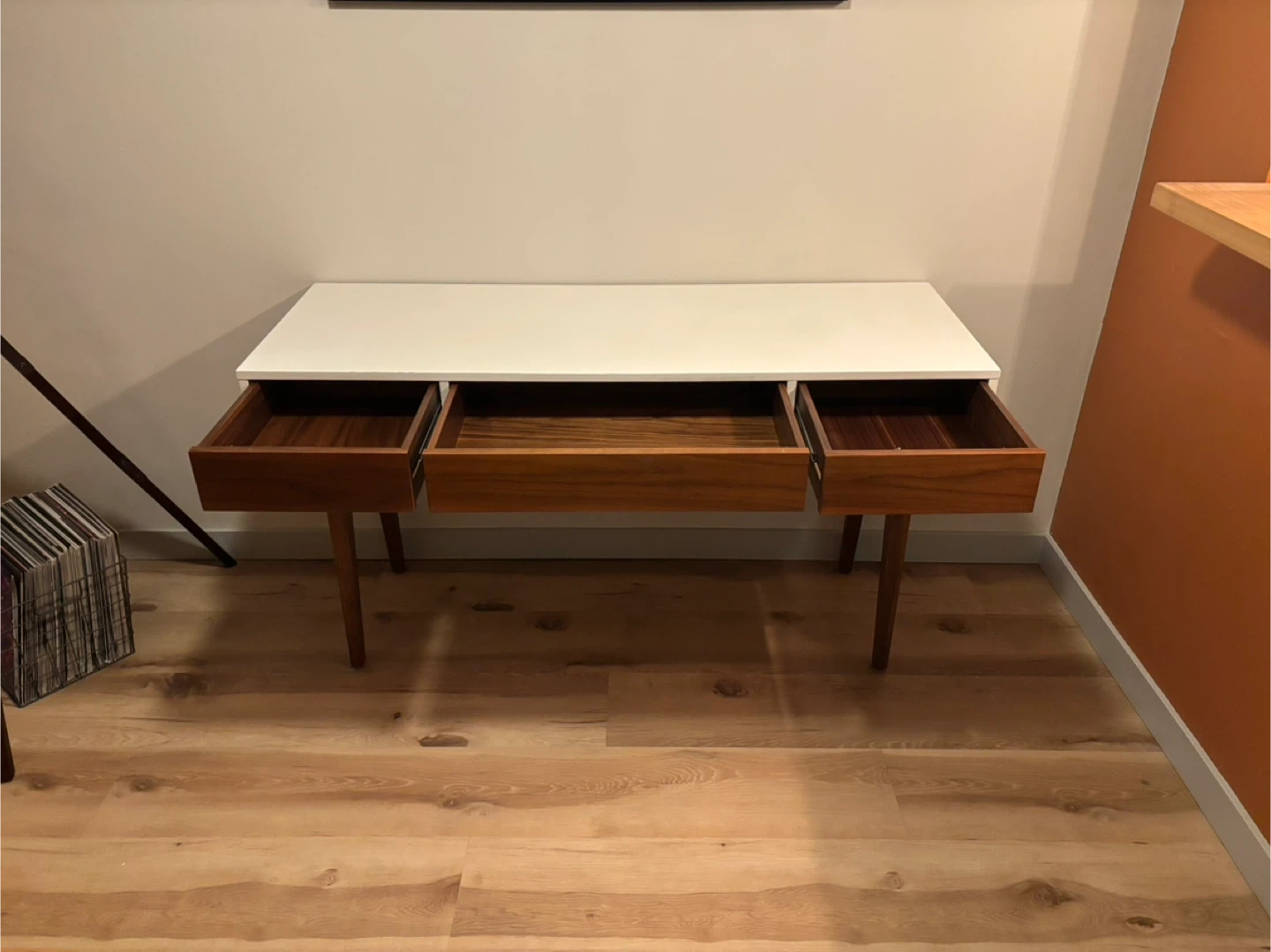 Minimalist white and walnut with 3 drawers. Lots of storage for laptop, notebooks, and office supplies.