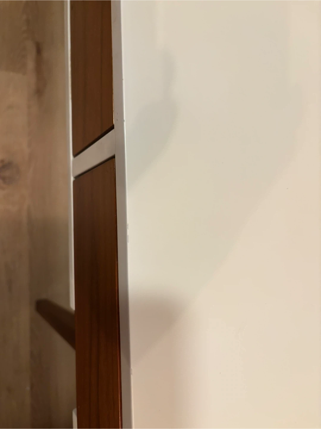 Solid wood legs, manufactured wood top. Light discolouration on the top from a leather camera strap that was sitting on it (pictured) and minor wear on the edges and left side (also pictured).