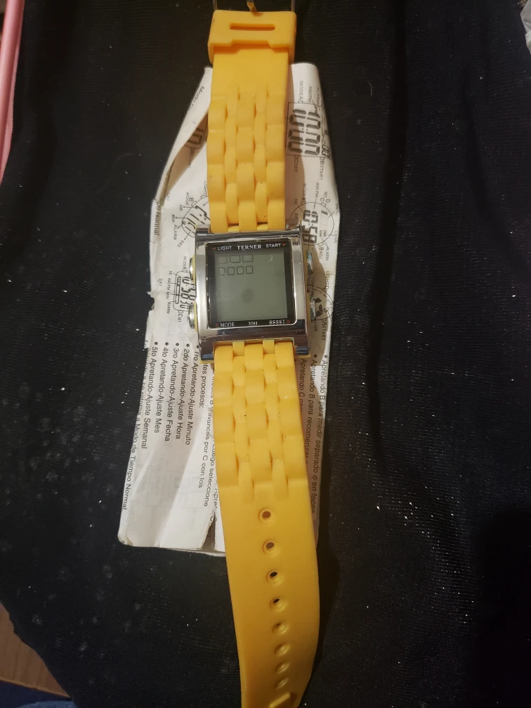 Terner 30M digital watch with a unique yellow band! This watch features a digital display with functions for light, mode, and reset. It also has start/stop capabilities. The band is a vibrant yellow color and has a textured design. Perfect for adding a pop of color to your wrist!