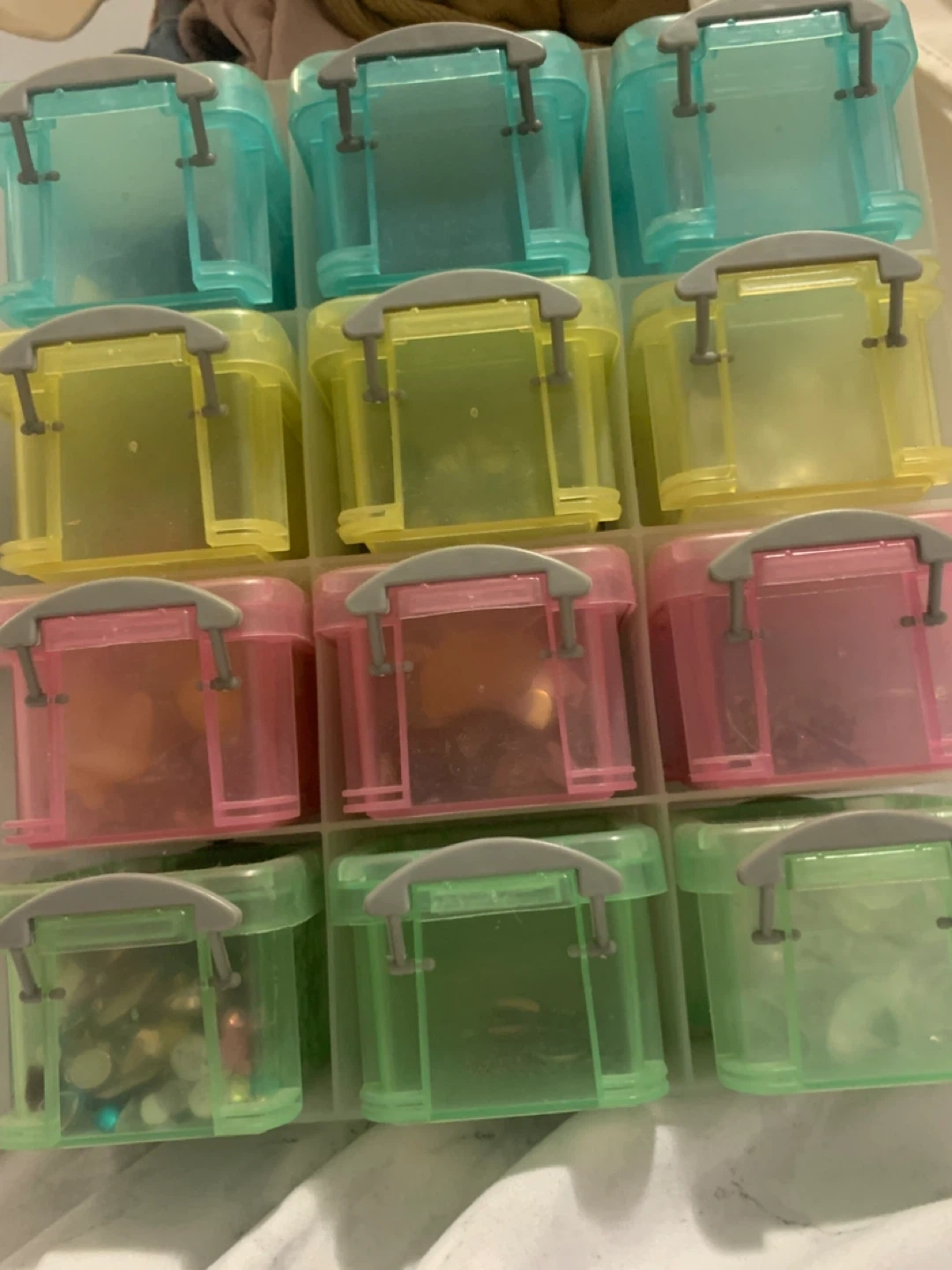 Multicoloured storage containers! They are perfect for organizing small items like beads, crafts, or office supplies. The set includes 4 colours, so you can easily colour-code your items.