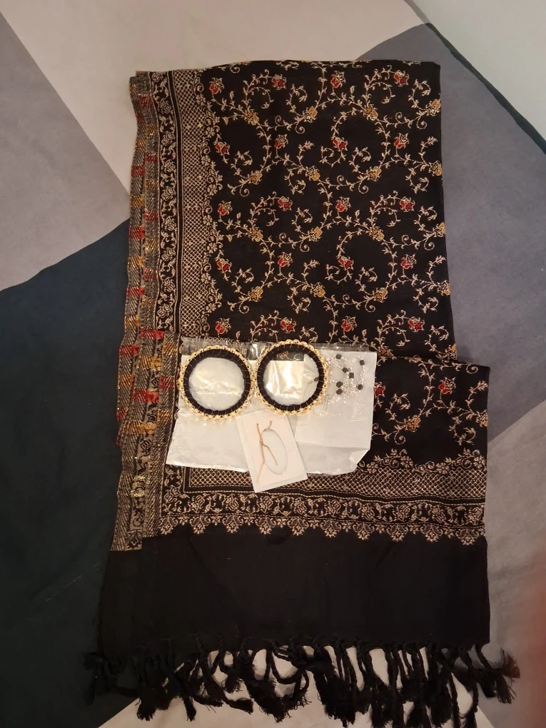-Hand-embroidered Kashmiri shawl with a floral pattern and fringe + pair of thread bangles + anklet + earrings