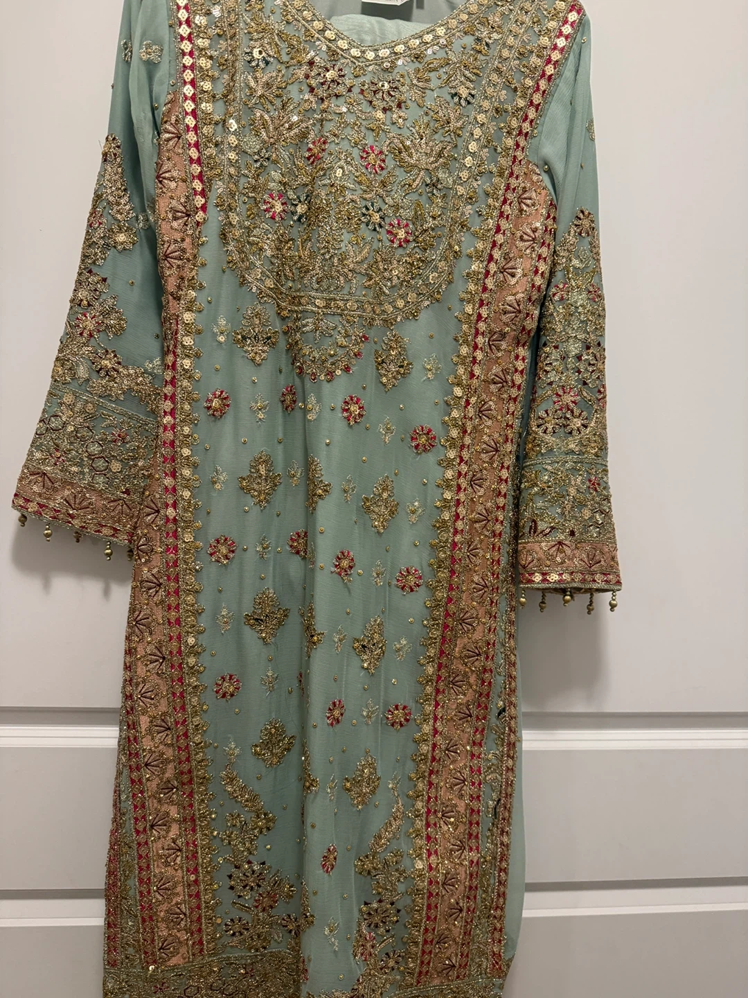 Beautifully embroidered Pakistani salwar kameez suit in a lovely light green colour with intricate gold and pink detailing. Includes matching pants and a small purse. Perfect for a special occasion!