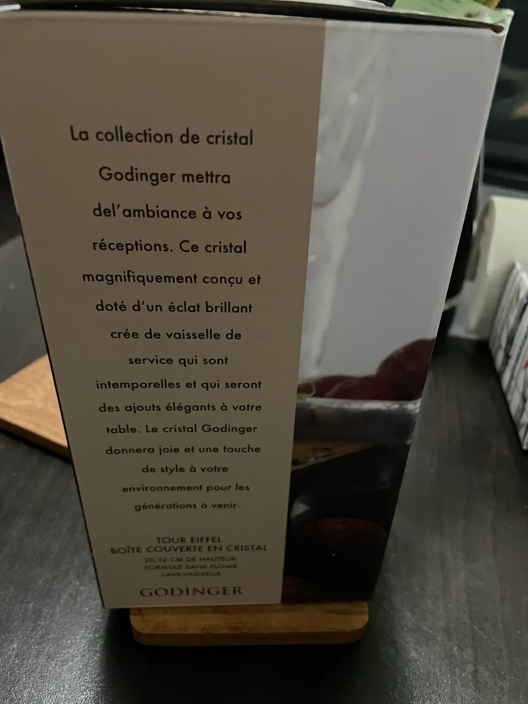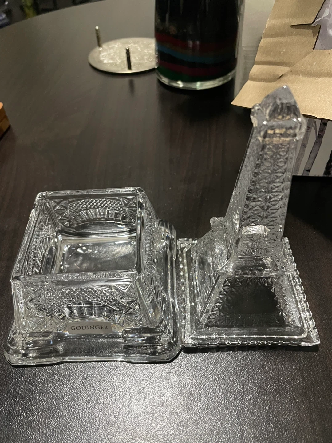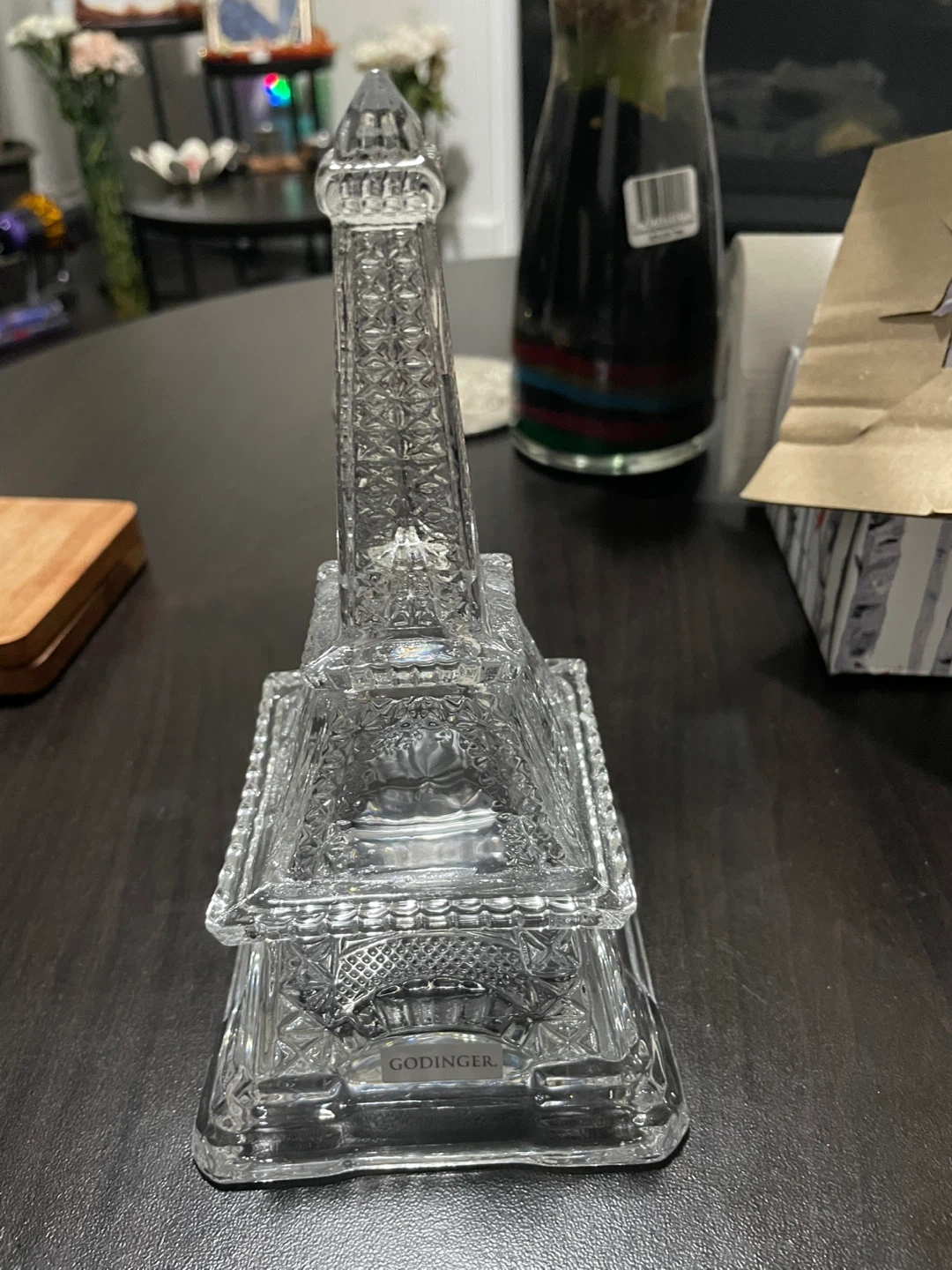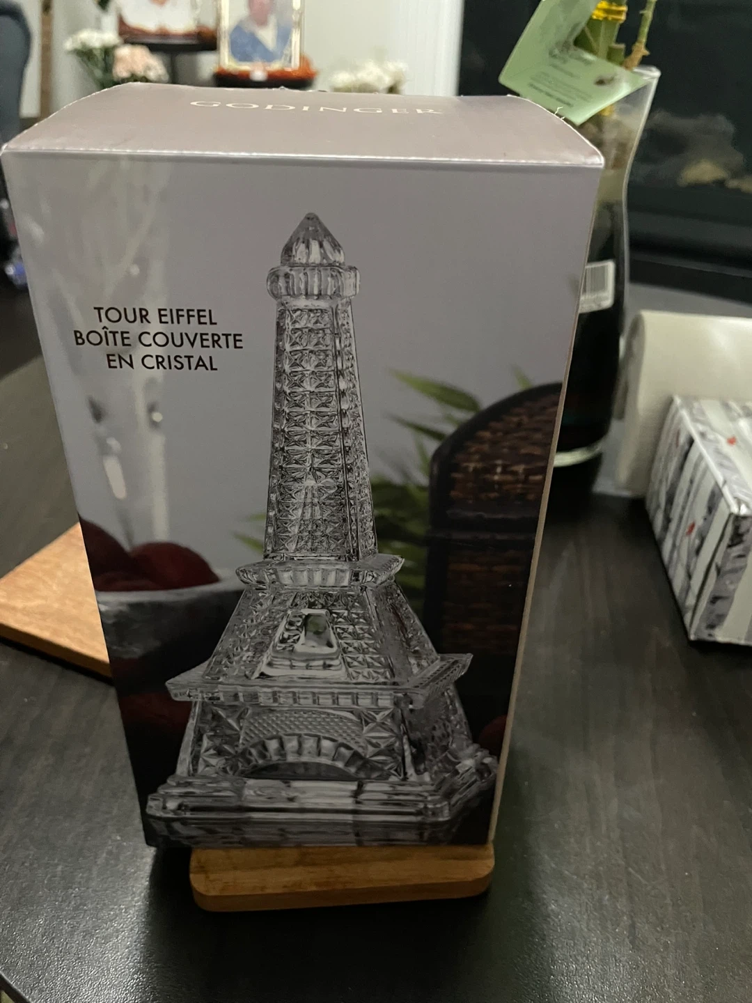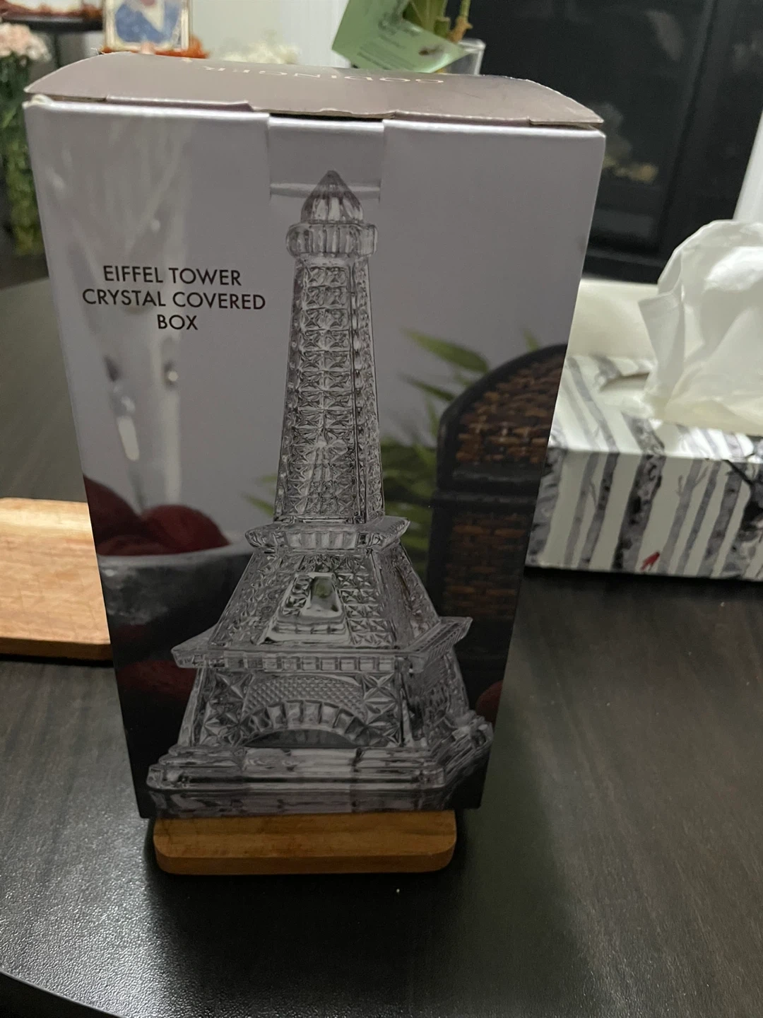 Selling a Godinger Eiffel Tower crystal covered box! This beautiful piece from the Godinger Crystal Collection will enhance the atmosphere at any occasion. It's a timeless design and elegant addition to your home. The box is dishwasher safe and comes with a wooden base