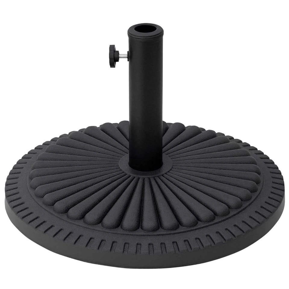 Outsunny patio umbrella base stand with a round cement parasol holder for outdoor use in your patio, garden, or at the beach. It fits poles with a diameter of 1.4", 1.5", and 2". This heavy-duty umbrella base weighs 31lbs for stability. The adjustable screw fastening keeps your umbrella securely in place. Its elegant oblong petal design adds a decorative touch to your outdoor space. The overall dimensions are 19.25" x 12.5"H. Please ensure your umbrella pole fits before purchasing. Assembly is required for setup.