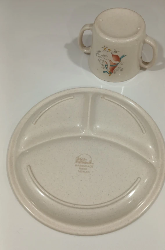Vintage children's divided plate by International Marmalade. Features geese with fruit and ribbons. Hard plastic. 8 3/8" diameter. Gently Used. Hamilton.L8K 2H3
