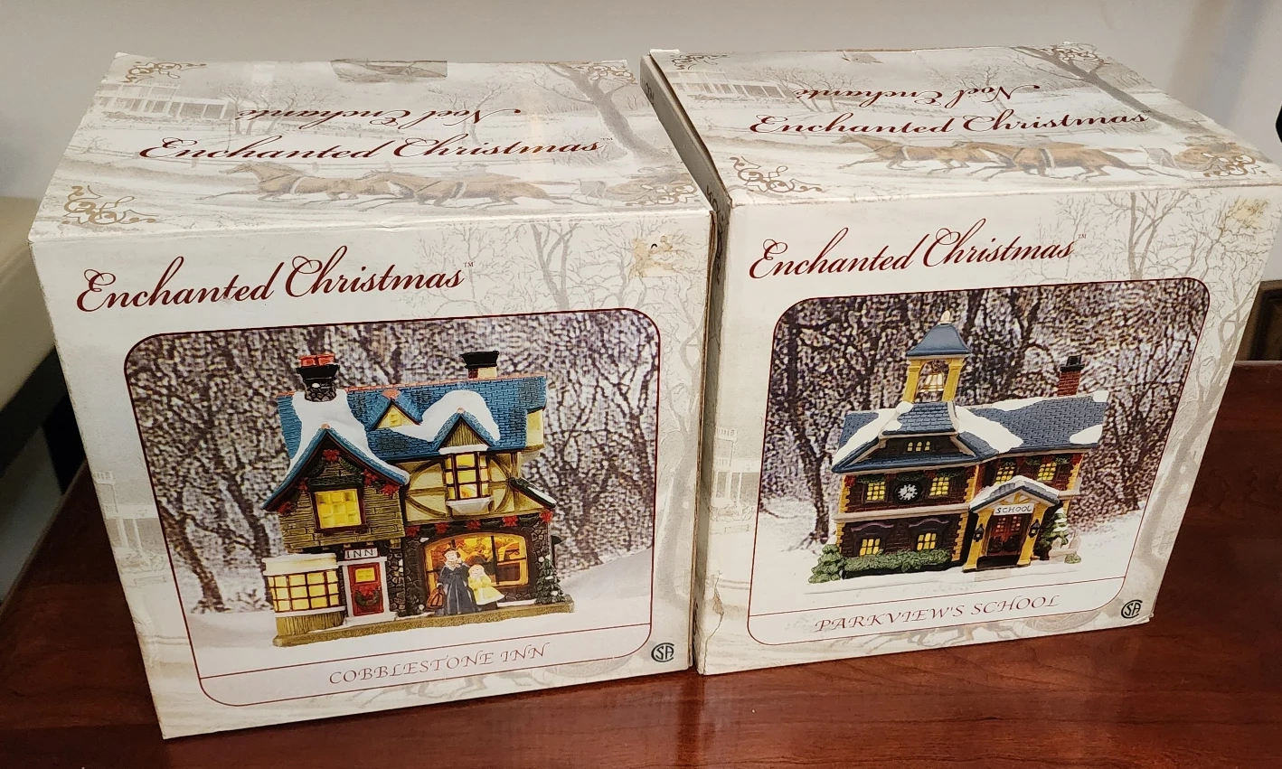 Selling two adorable pieces from the Enchanted Christmas Village collection: the Cobblestone Inn and Parkview School. They come in their original boxes, ready to add a touch of Christmas magic to your home