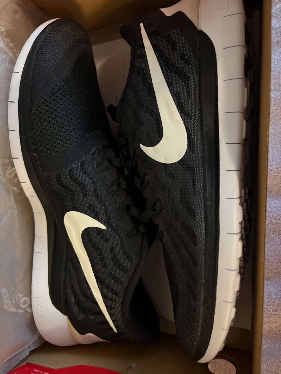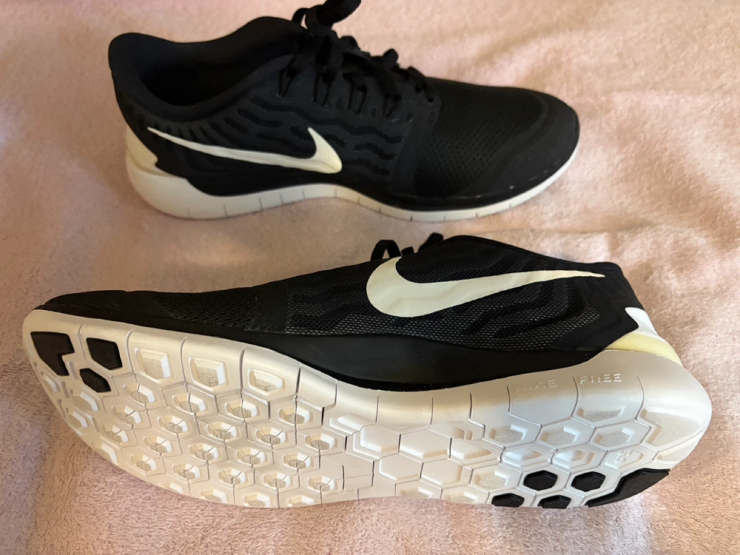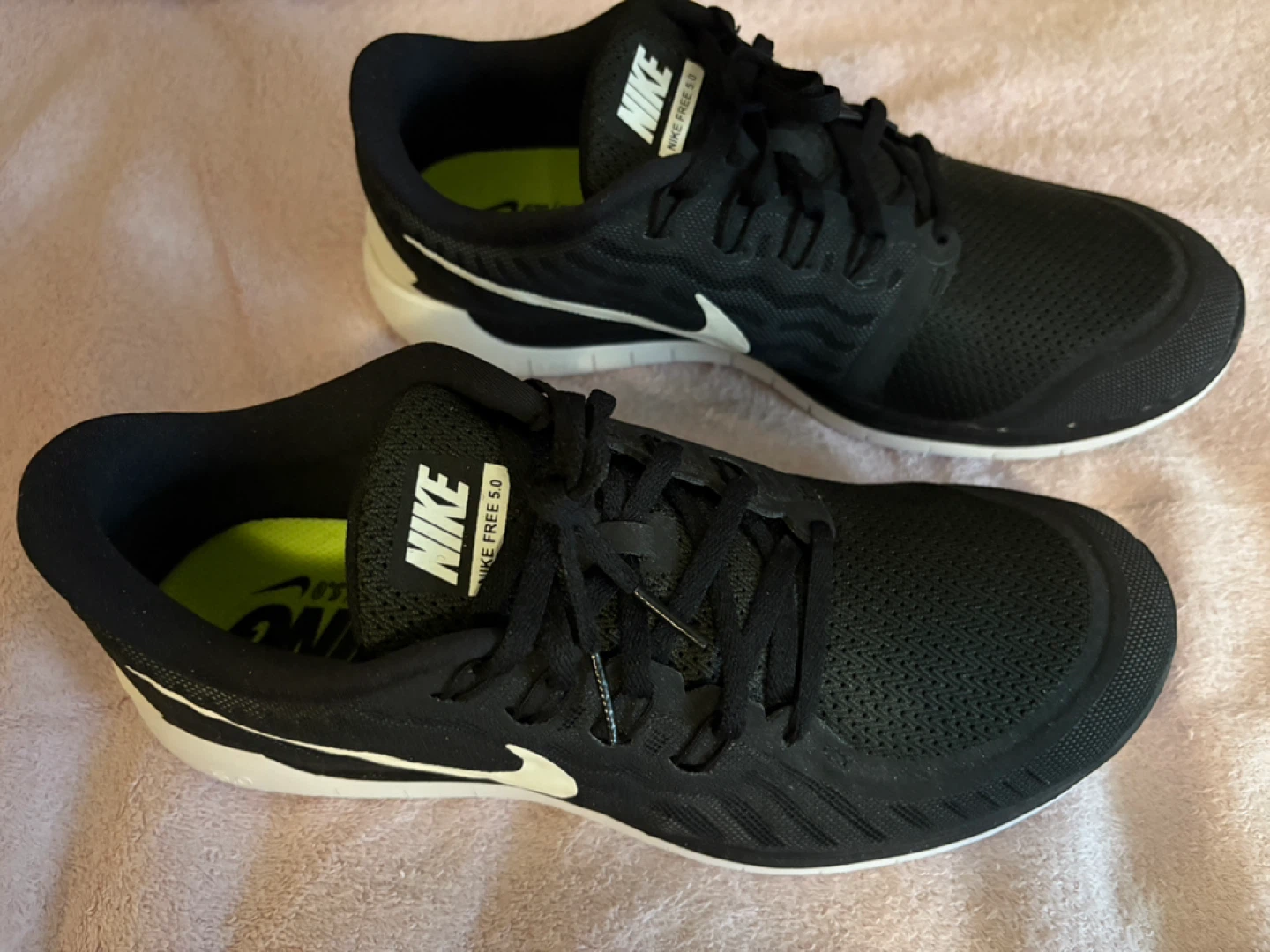 Selling a pair of Nike Free 5.0 running shoes in black and white. They're in great shape and ready for a new home. Perfect for running or everyday wear!