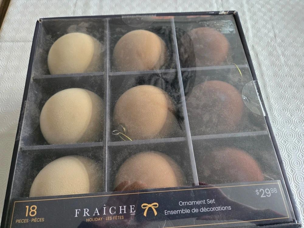 Selling a Fraiche Holiday ornament set, which includes 18 pieces! The set features a variety of neutral tones, perfect for adding a touch of elegance to your holiday decor. Originally bought for $29.98 location weston rd and Rutherford rd. Cash only pls.