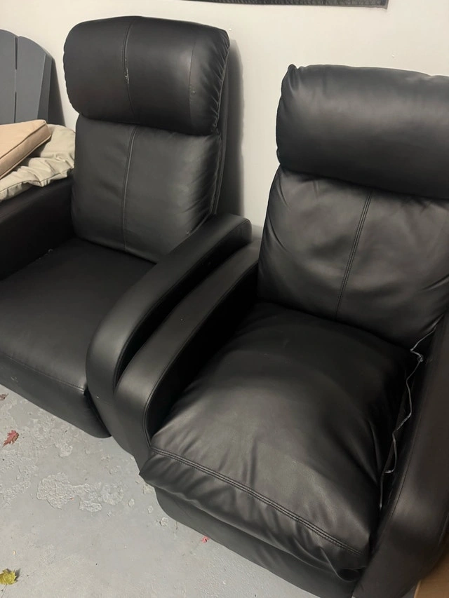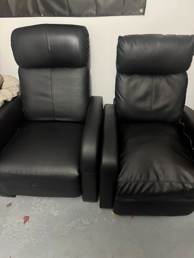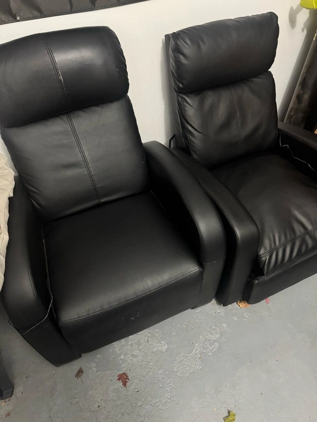 I'm selling a pair of used black recliner chairs, perfect for adding comfort to any room. These recliners feature a sleek design and padded support for ultimate relaxation. Although they have been previously owned, the chairs are still in good condition, offering great value for the price.
