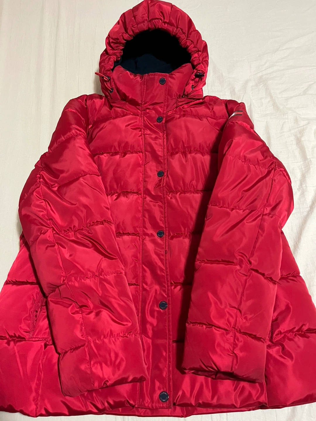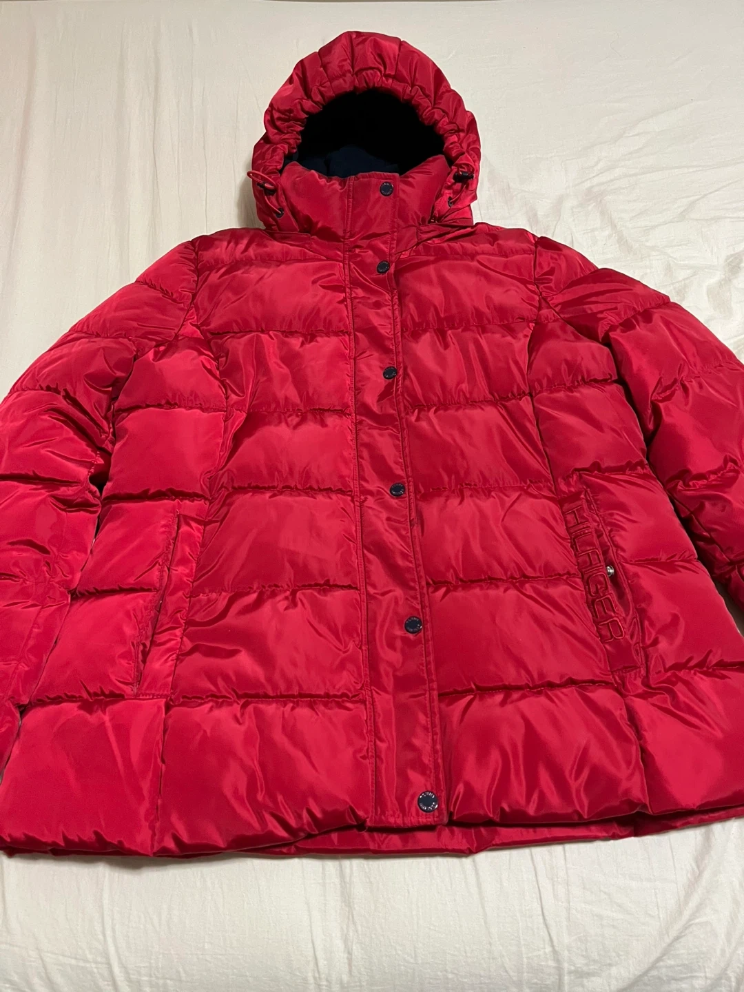 Selling a Tommy Hilfiger puffer jacket in a vibrant red colour! It's in great condition and perfect for staying warm during the colder months. The jacket features a hood and a comfortable, stylish design. Let me know if you're interested!