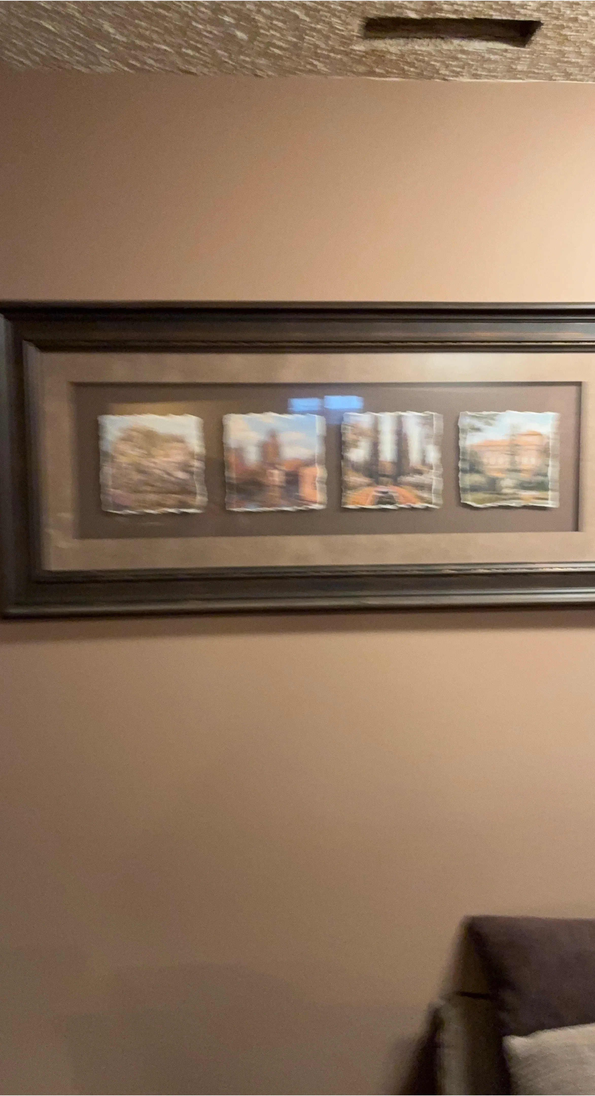 A lovely framed piece of wall art featuring four different cityscapes. It's in great condition and ready to add a touch of urban charm to your home