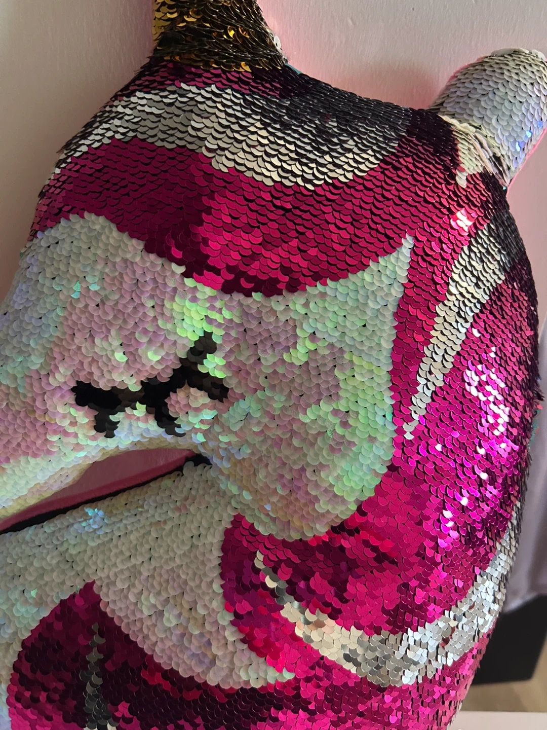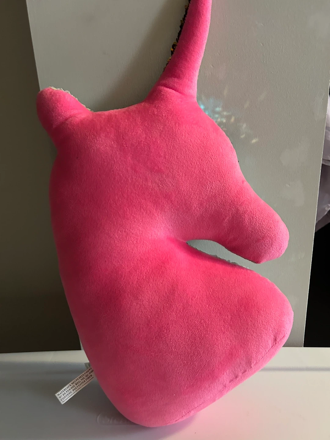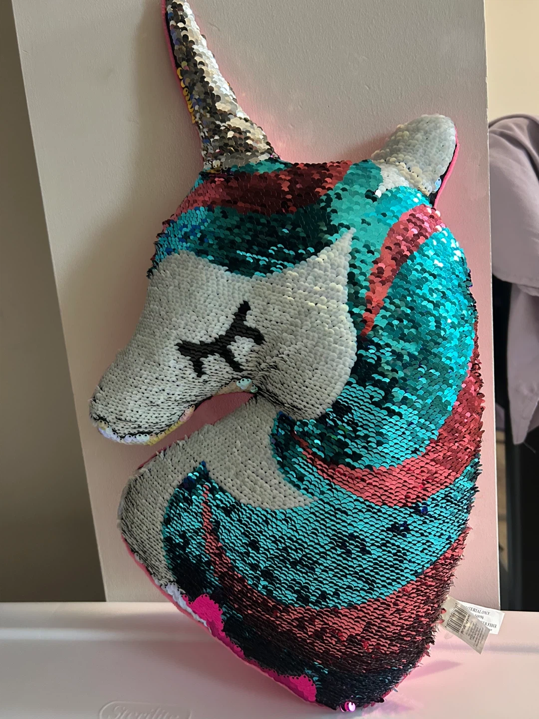 a cute unicorn shaped pillow with sequins on one side and soft pink material on the other! The sequins are colourful and add a fun touch to any room.