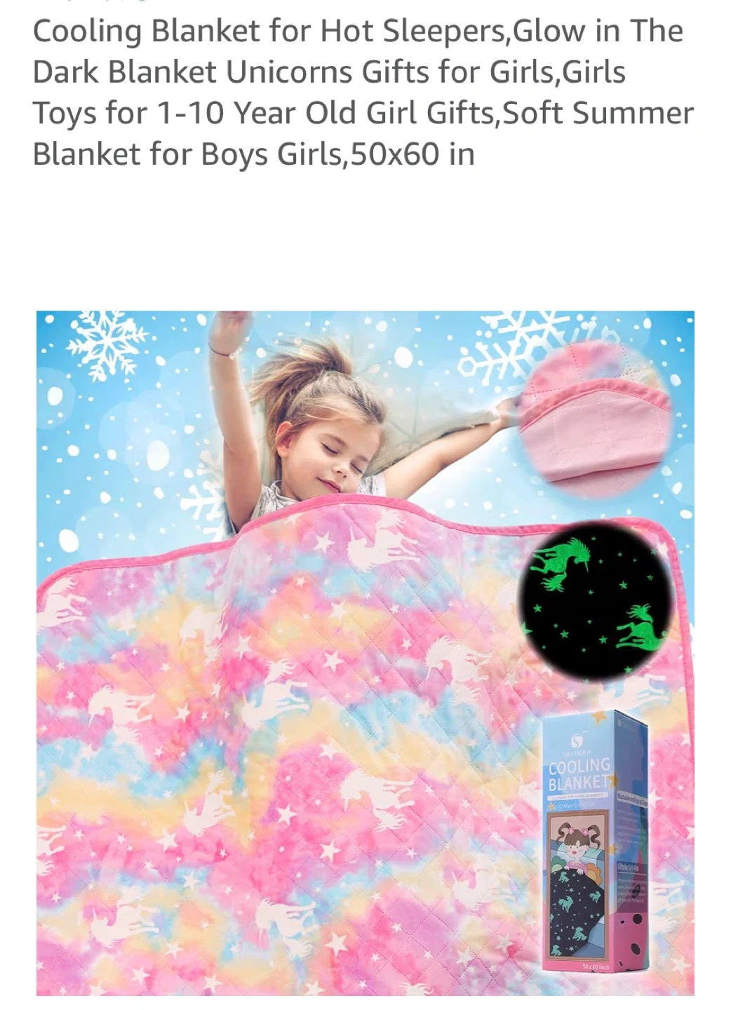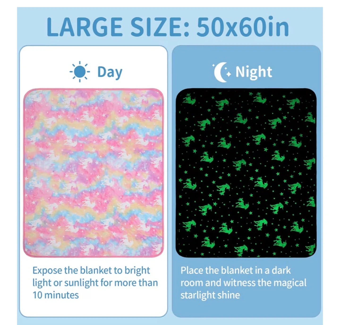 This is a really cute blanket that glows in the dark! It's perfect for sleepers of all ages, features a fun unicorn design. The blanket is soft, comfortable, and machine washable. It's also skin-friendly and breathable. It's large size, 50x60 inches, is perfect for kids and adults alike. It’s $73 on Amazon. I have 2 available.