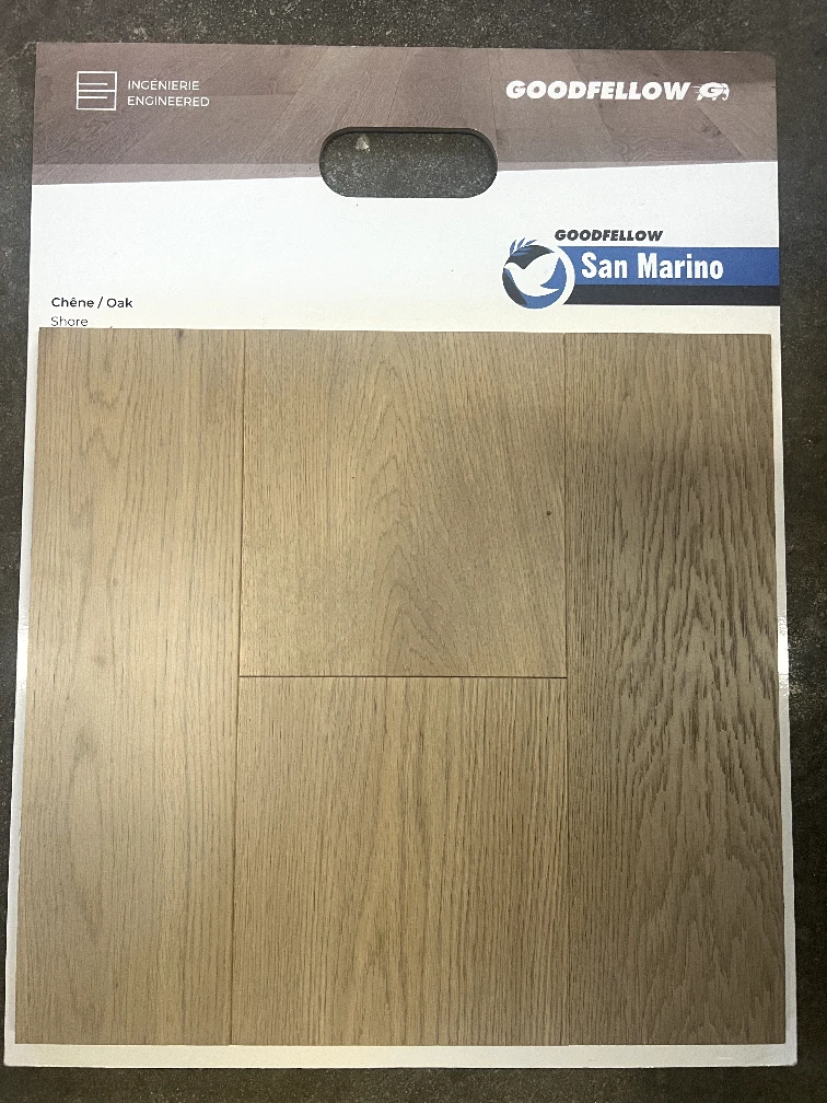 Selling 150sqft 7½" wide x ½ thick, Goodfellow San Marino Oak Shore flooring. It's engineered hardwood flooring with a beautiful oak finish. Perfect for adding a touch of elegance to any room!