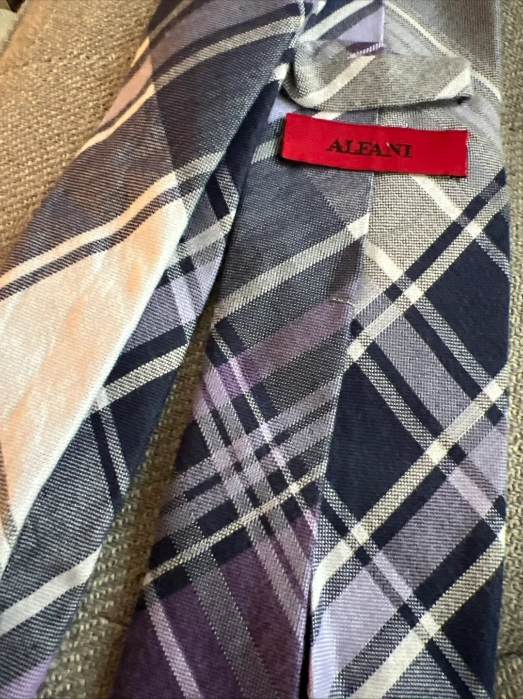Selling a set of assorted plaid ties! There's a variety of colors and patterns. Materials include polyester, silk, and linen. One tie is from the brand Alfani
