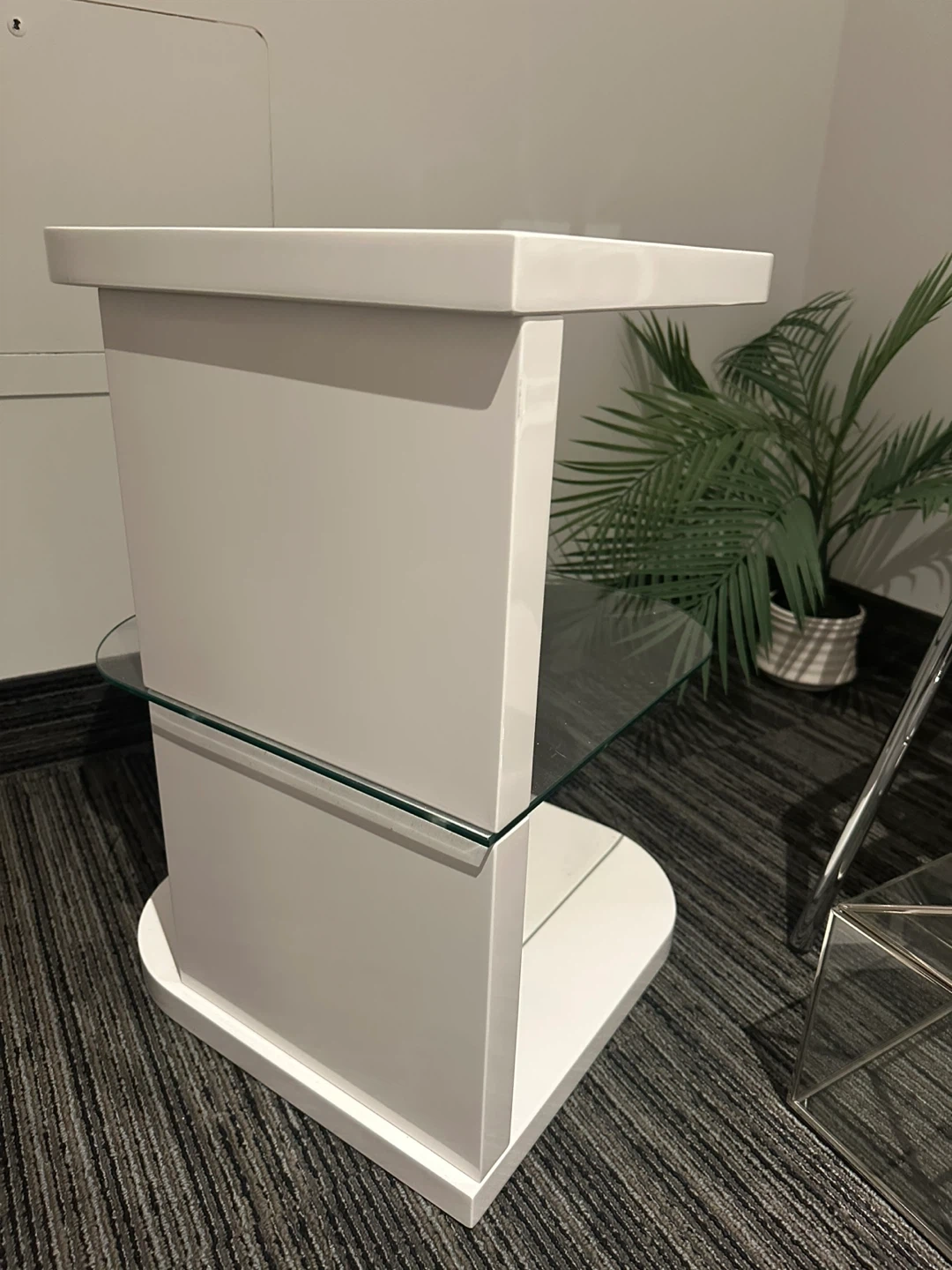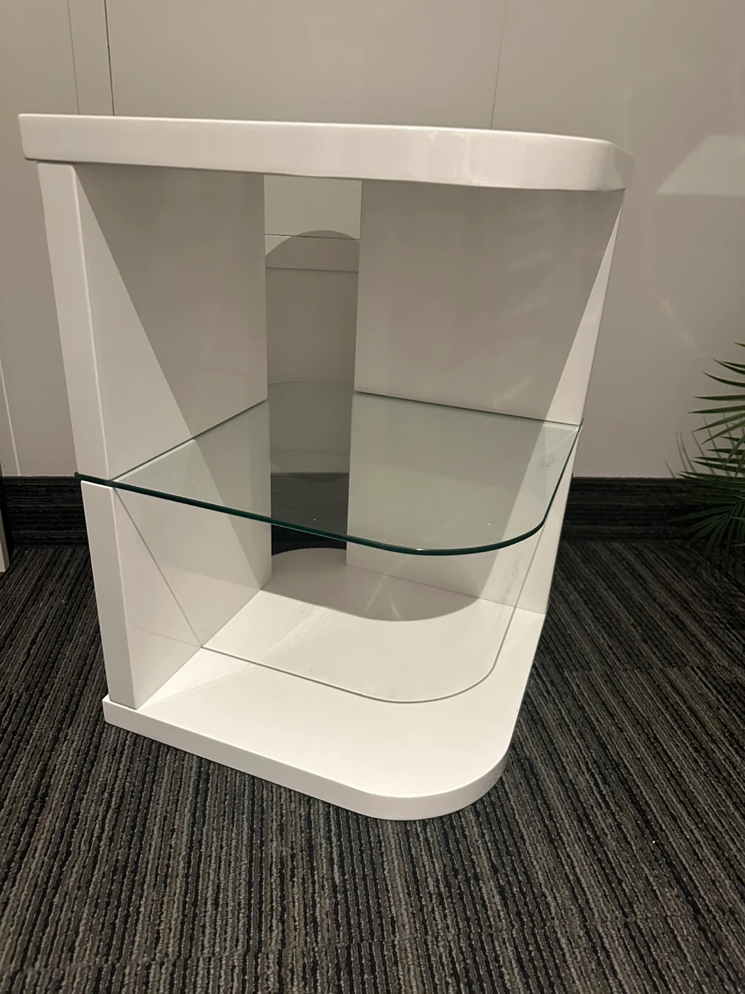 Here's a stylish white end table with a glass shelf! It's in great shape and would look lovely in any living room or bedroom. The table is approximately 23 inches tall and 18 inches wide.