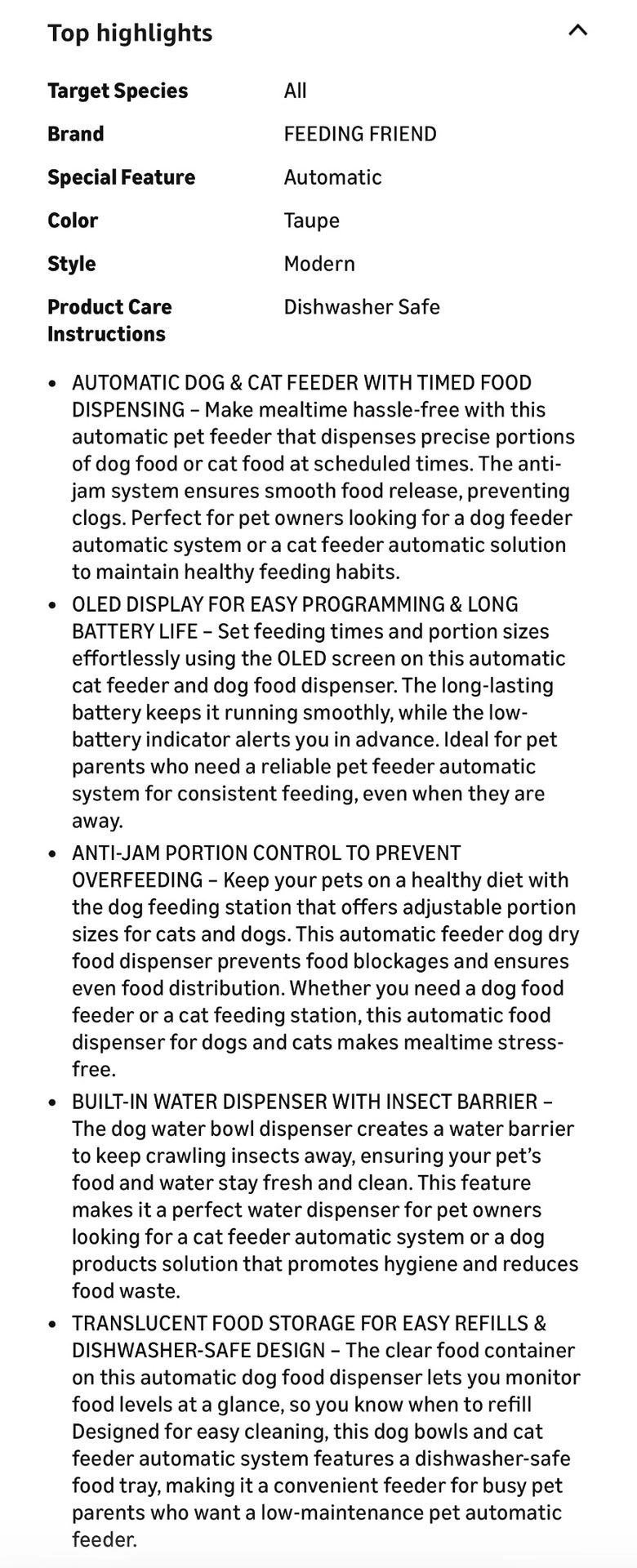 Automatic pet feeder with portion control, OLED display, and anti-jam design. Battery operated. Perfect for medium to large dogs and cats! It features a translucent food container, a raised food dish, and an anti-microbial water bowl that is dishwasher safe. It also rotates 360 degrees and has an anti-jam, timed food release. Designed to repel ants. Dishwasher safe!