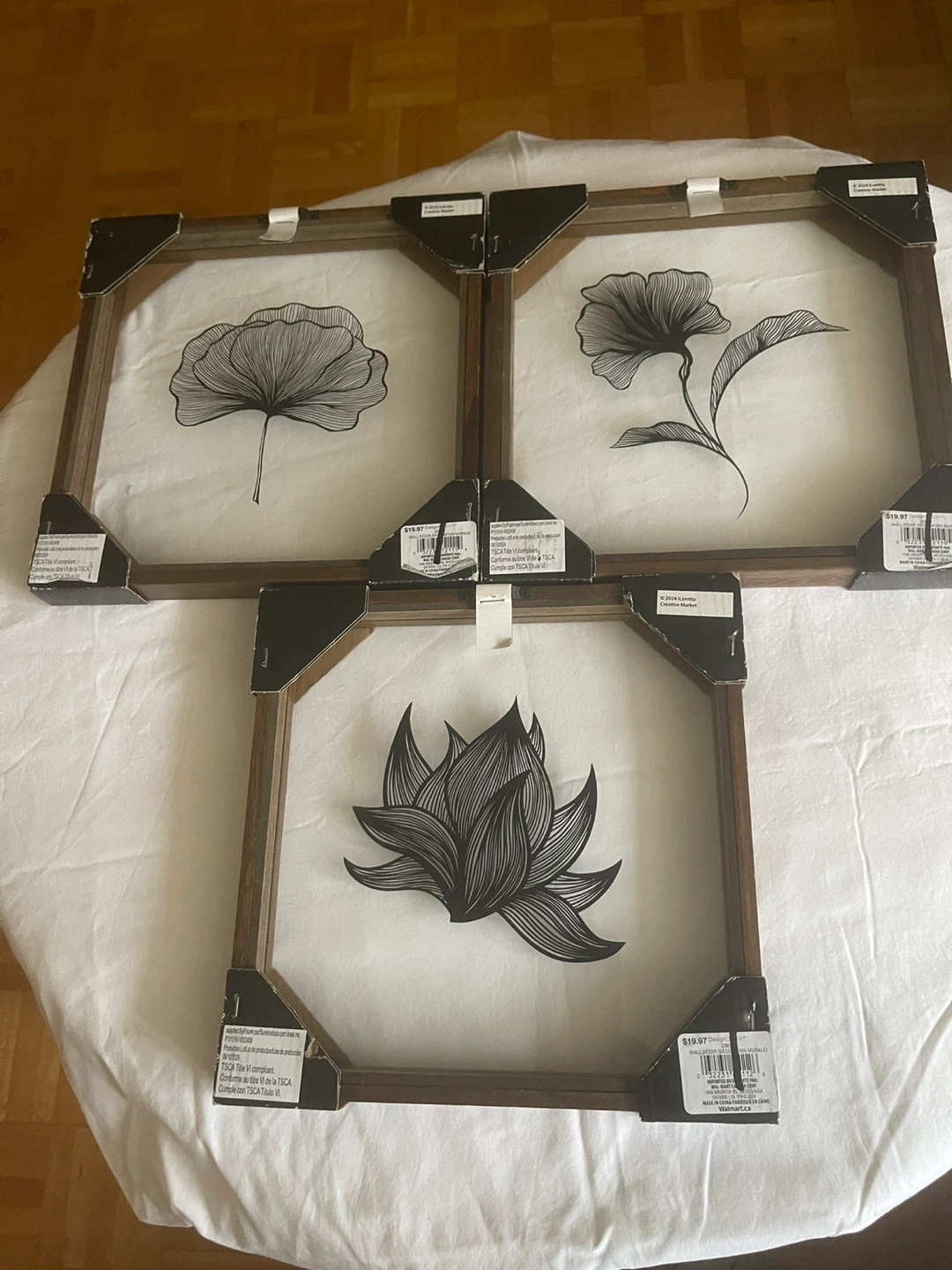 Selling a set of 3 wall decor pieces! They are 10in x 10in (25.4cm x 25.4cm). Each piece features a different floral design. They're in great condition and ready to add a touch of elegance to your home!