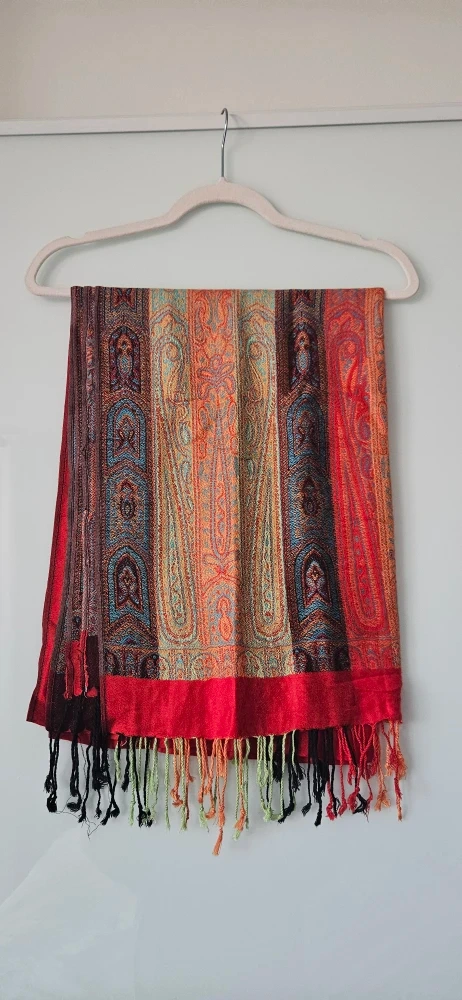A beautiful scarf with a vibrant red colour and intricate paisley pattern! It's brand new, never been used and would be a lovely addition to any outfit, this winter or spring. Thick enough for winter