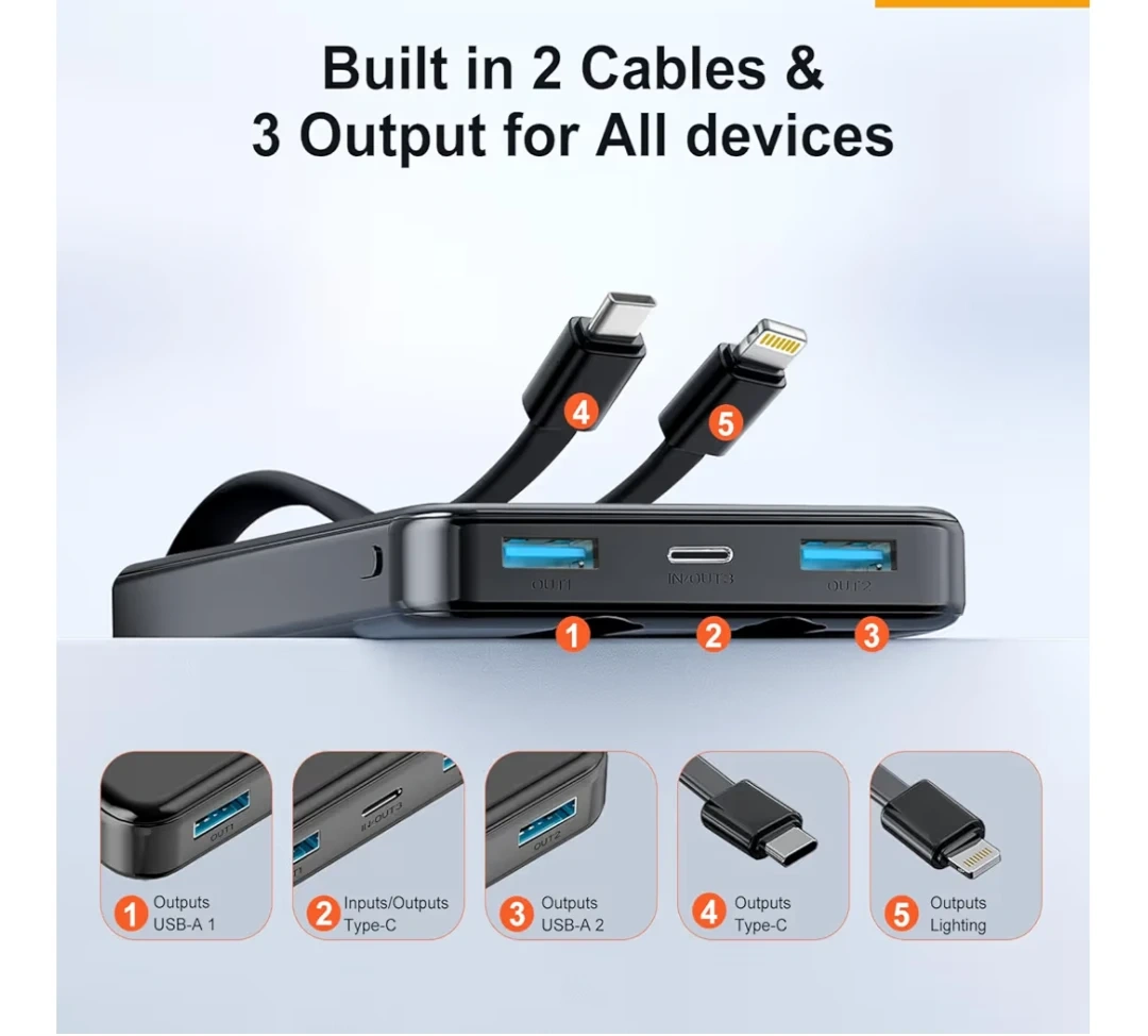 Selling a PB-02 power bank with a massive 25000mAh capacity! It features built-in Type-C and Lighting cables, so you'll always have the right connector on hand. It also has three output ports for charging multiple devices at once. Comes with original box and unwrapped.