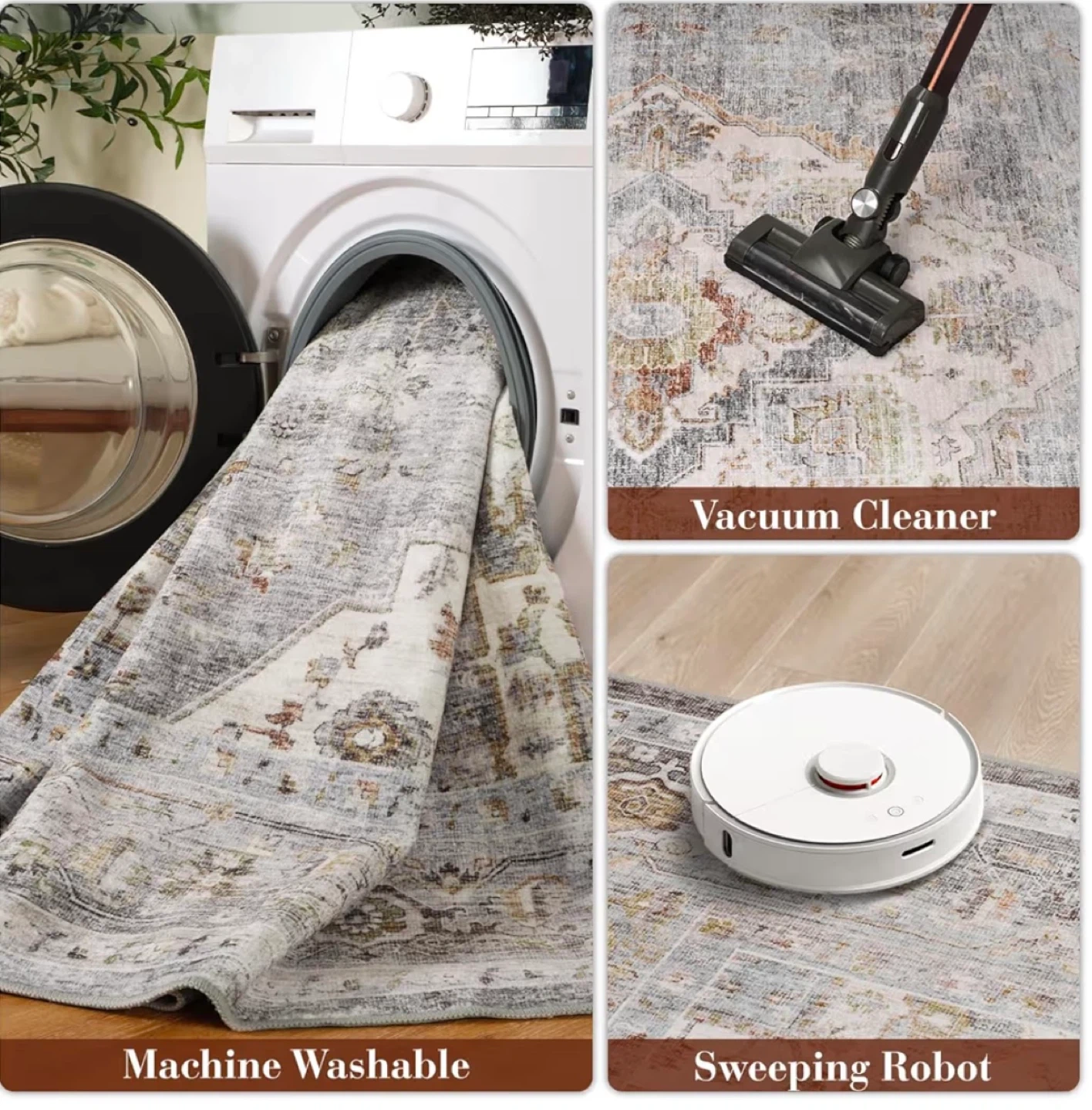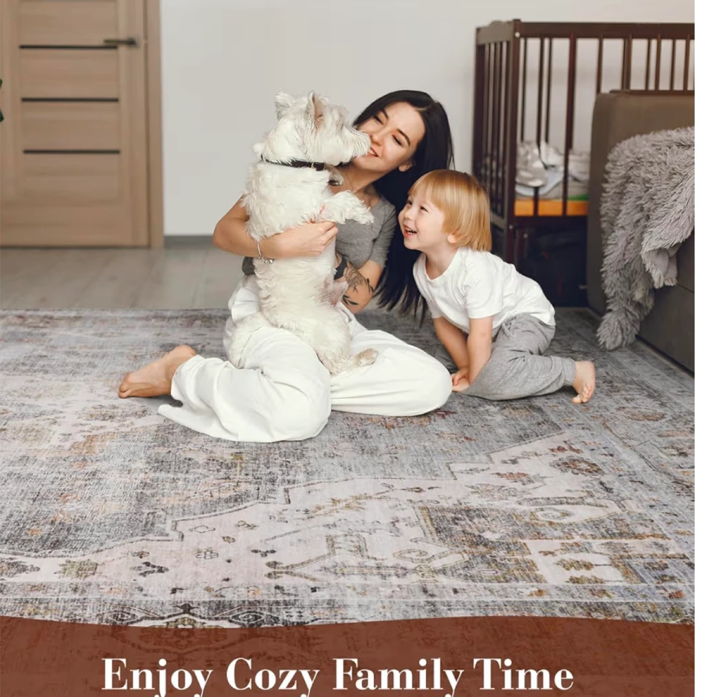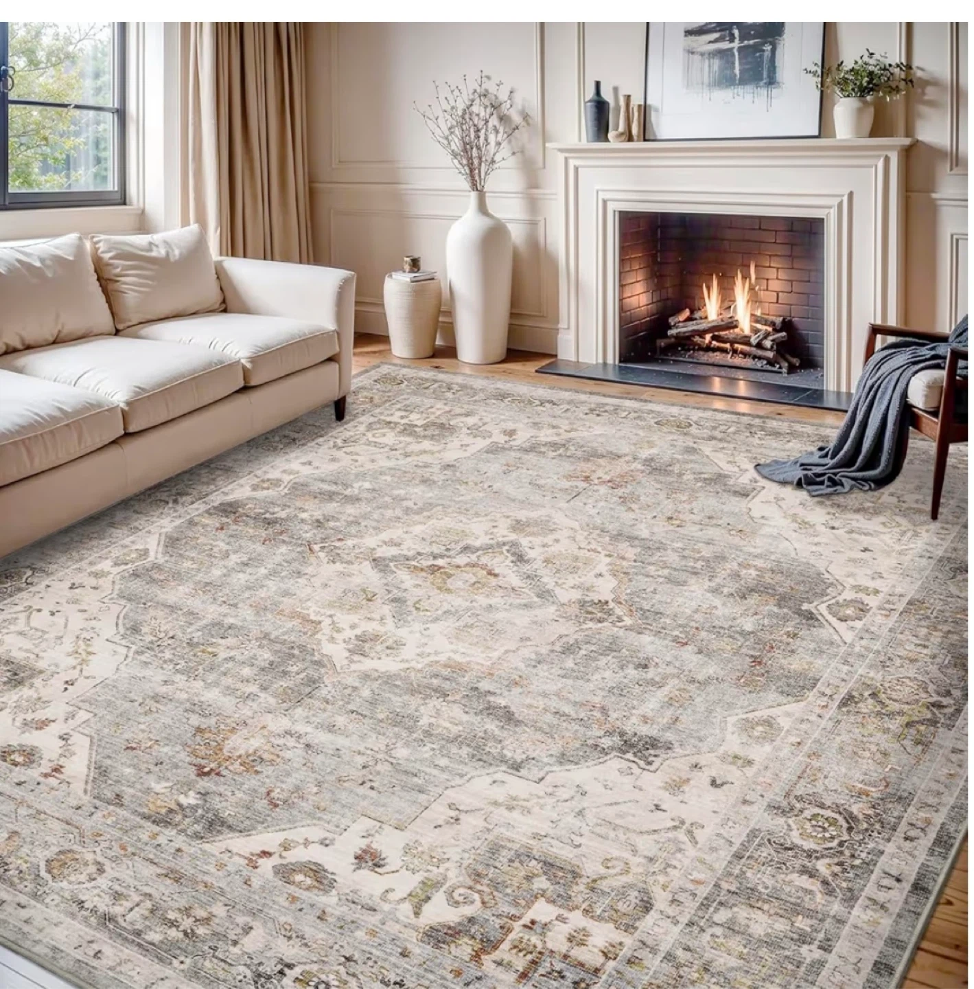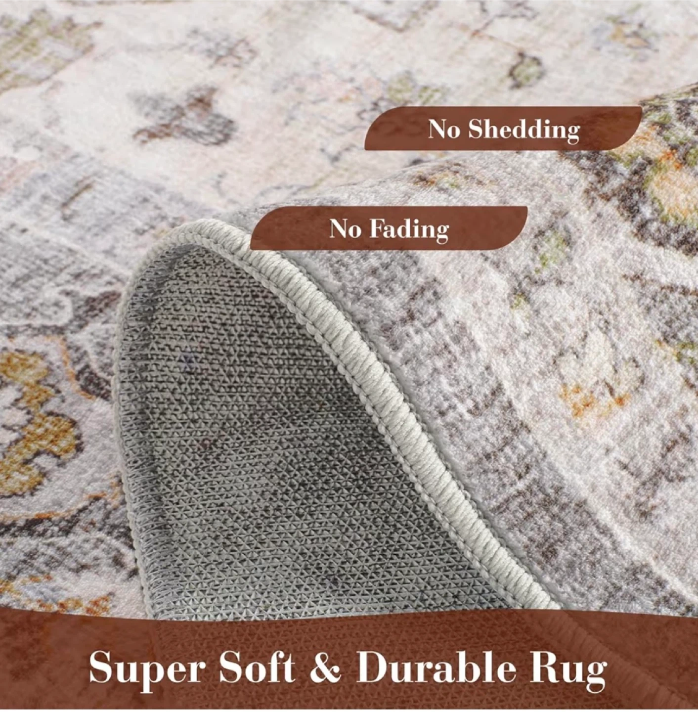 Selling a MontVoo area rug that's perfect for adding a touch of vintage style to your living room, dining room, or bedroom. It measures 9ft x 12ft and features a beautiful grey colour. This rug is machine washable and designed to be non-slip, making it both practical and stylish