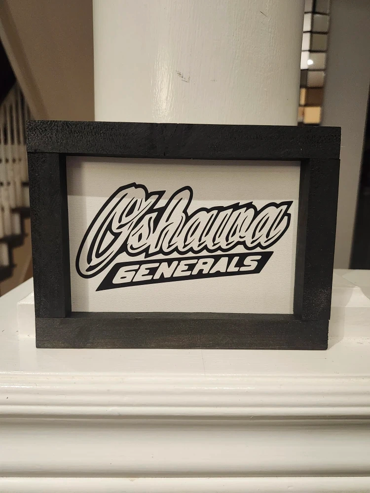 Selling a framed sign featuring the Oshawa Generals logo. It's in great shape and would be perfect for any hockey fan or to decorate a games room!