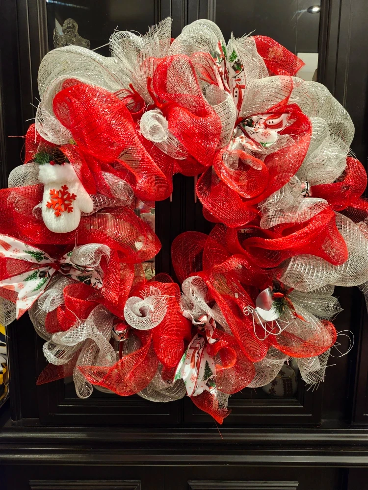 Selling a lovely handmade Christmas wreath! It features a festive mix of red and silver mesh, adorned with cute winter-themed ribbons and embellishments. Perfect for adding a touch of holiday cheer to your front door or any room in your home!