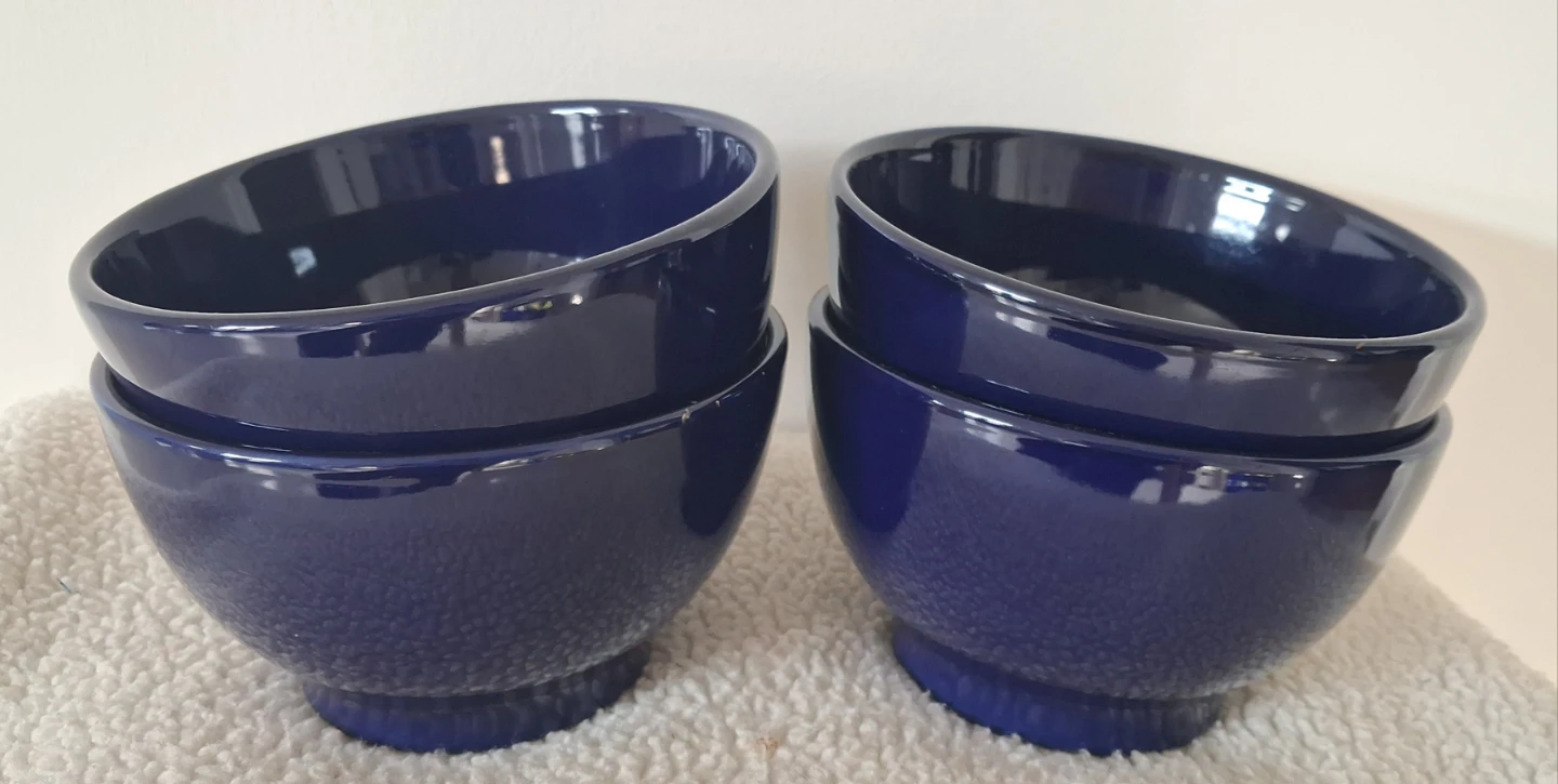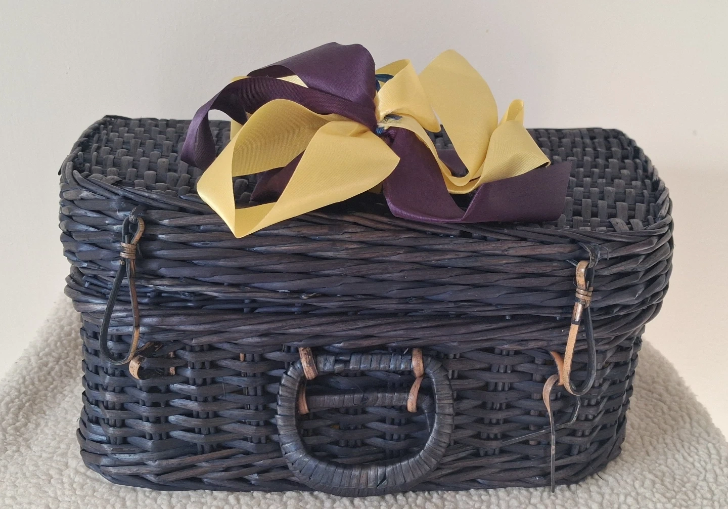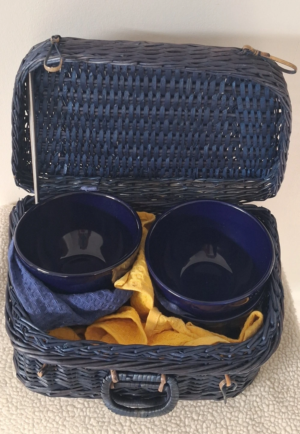 Selling a charming wicker basket that comes with a set of bowls and cloths. The basket is a lovely dark blue colour, and the bowls are a matching dark blue. There are also some yellow and blue cloths included. Perfect for picnics or storage!