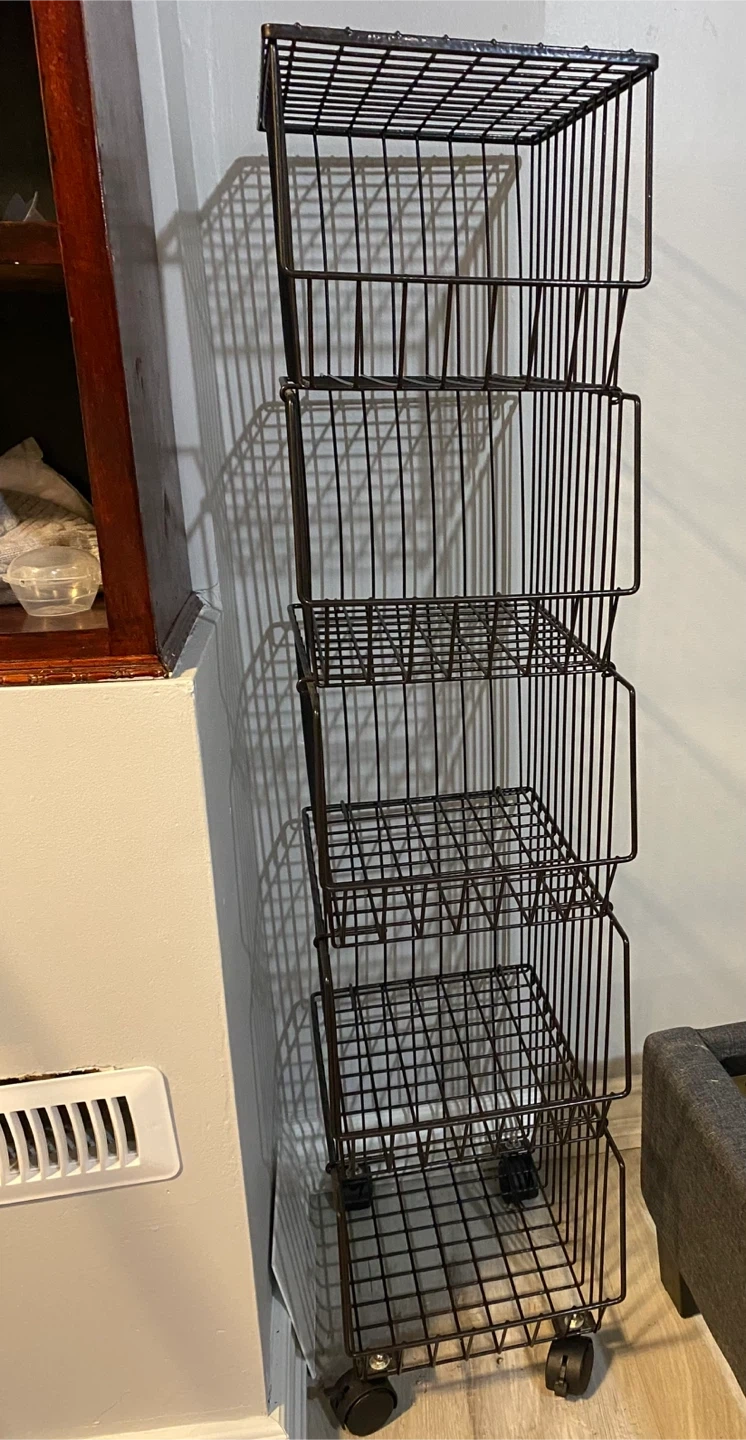 This is a rolling basket organizer. It's perfect for adding extra storage in any room. t's easy to move around. It's in great condition and ready for a new home
