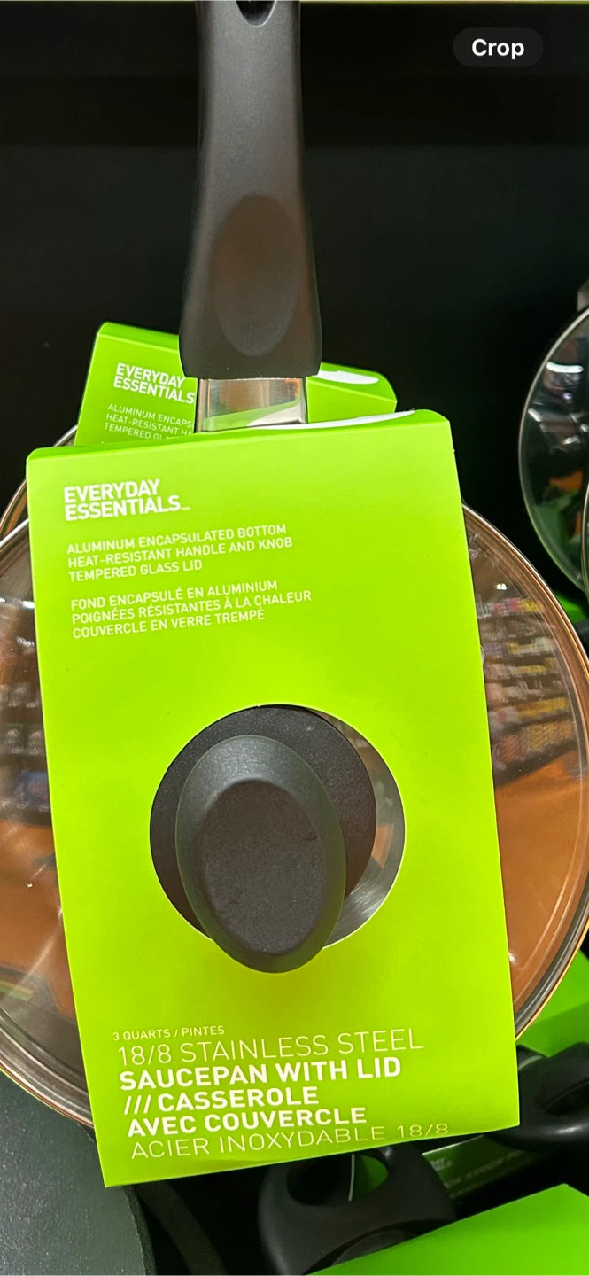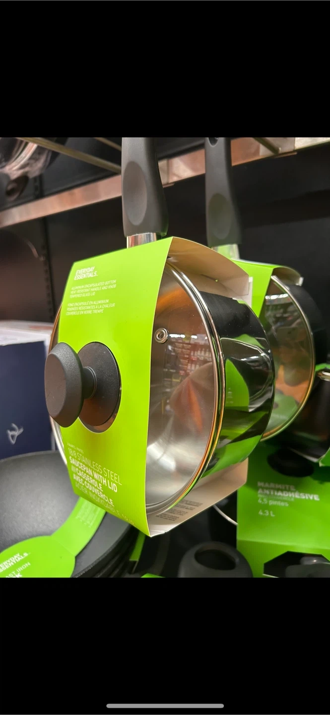 Selling a brand new Everyday Essentials 3 quart stainless steel saucepan with lid! It features an aluminum encapsulated bottom, heat resistant handle and knob, and a tempered glass lid