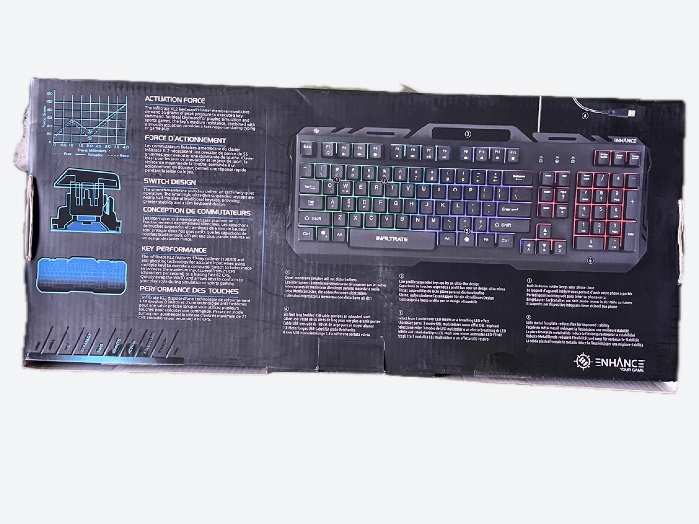 Selling an ENHANCE Infiltrate KL2 multi-color LED gaming keyboard. It's brand new and comes with the original box! This keyboard features quiet membrane switches and multi-color LED lighting. It's ready to elevate your gaming experience.