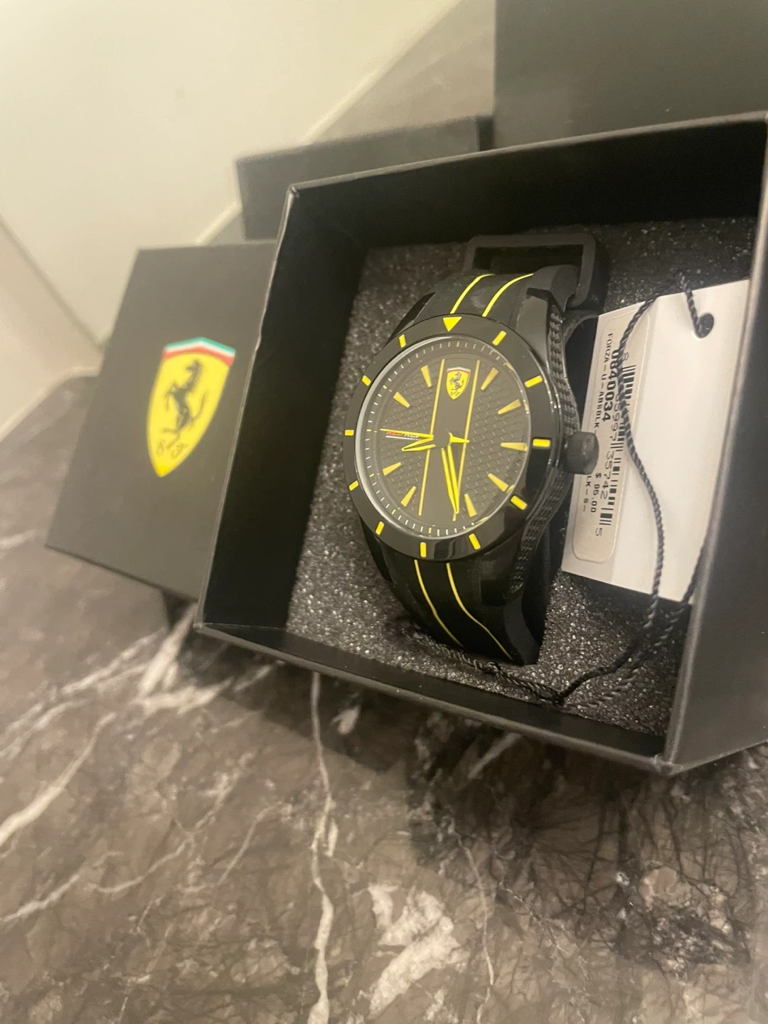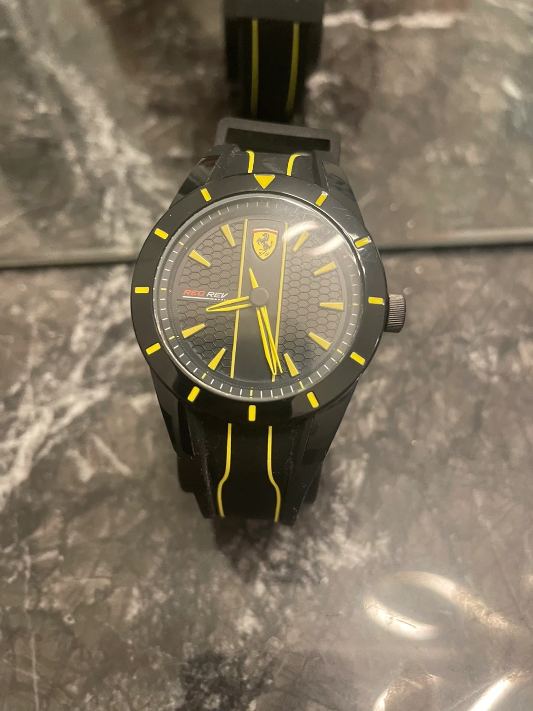 Selling a brand new Ferrari Red Rev Forza watch! It's black with yellow accents and comes in its original box. The tag shows it originally sold for $95 USD. This would make a great gift for any Ferrari fan!
