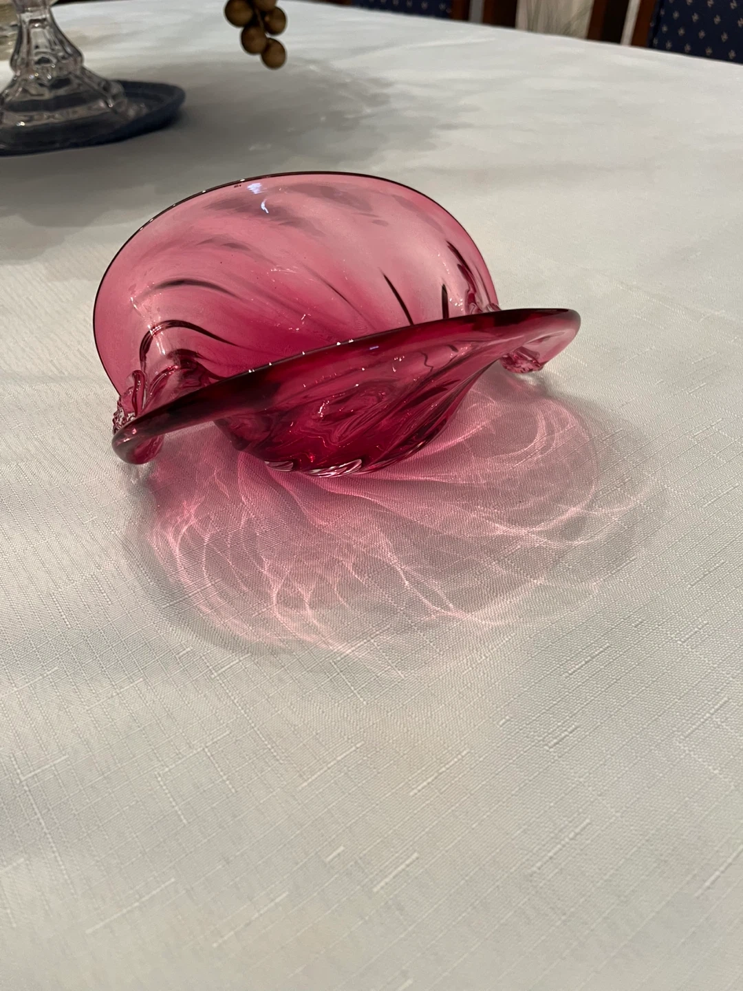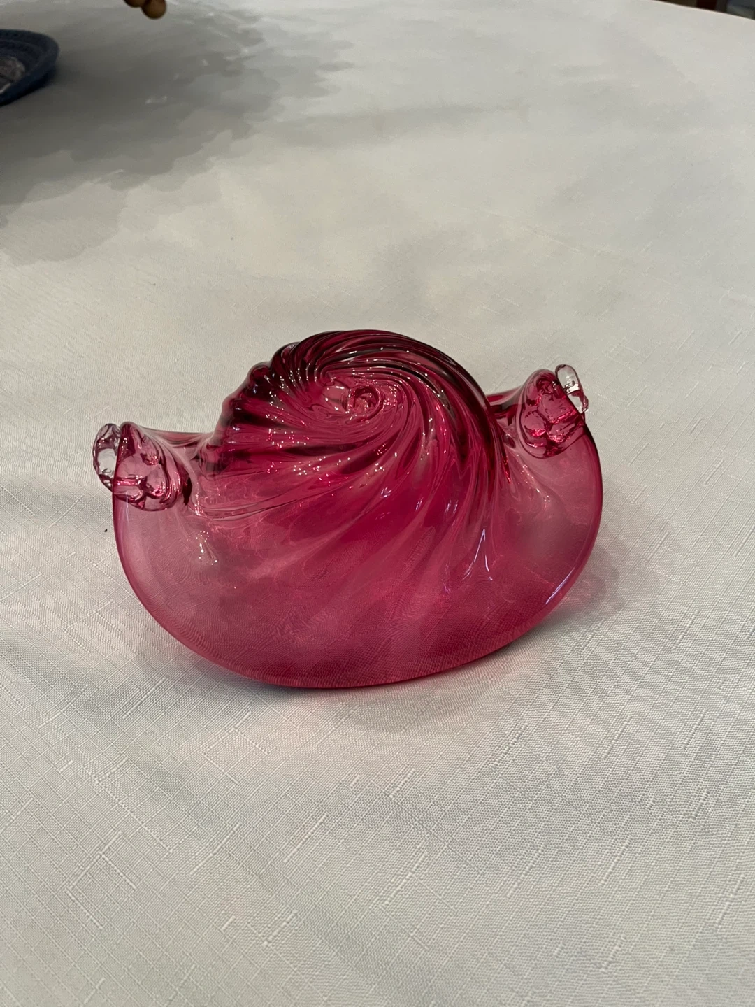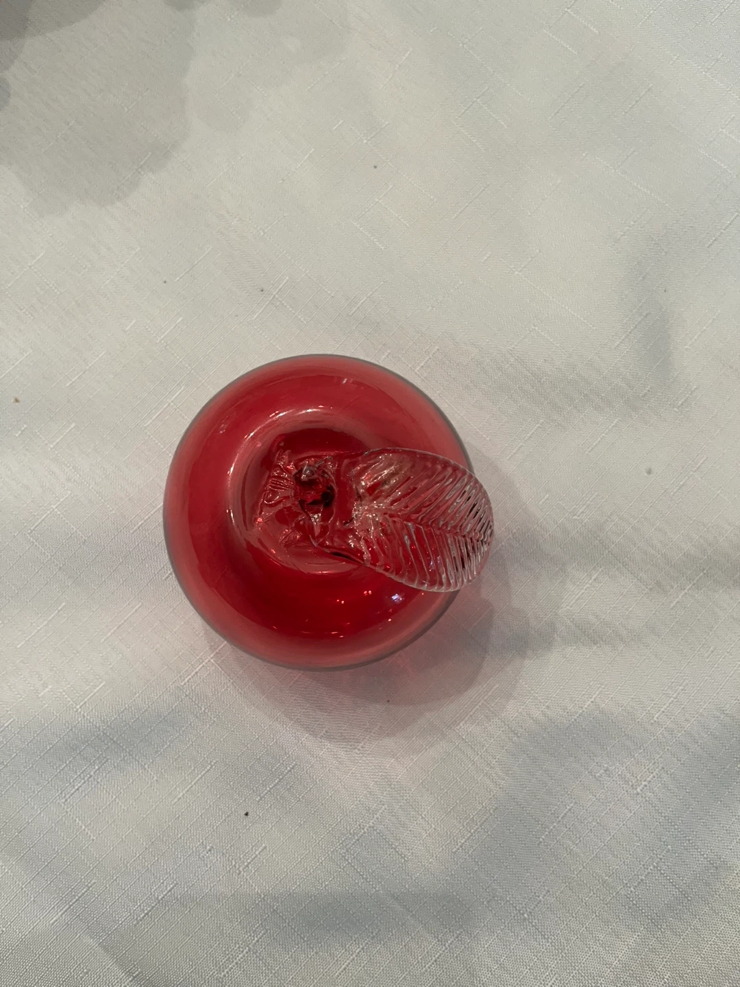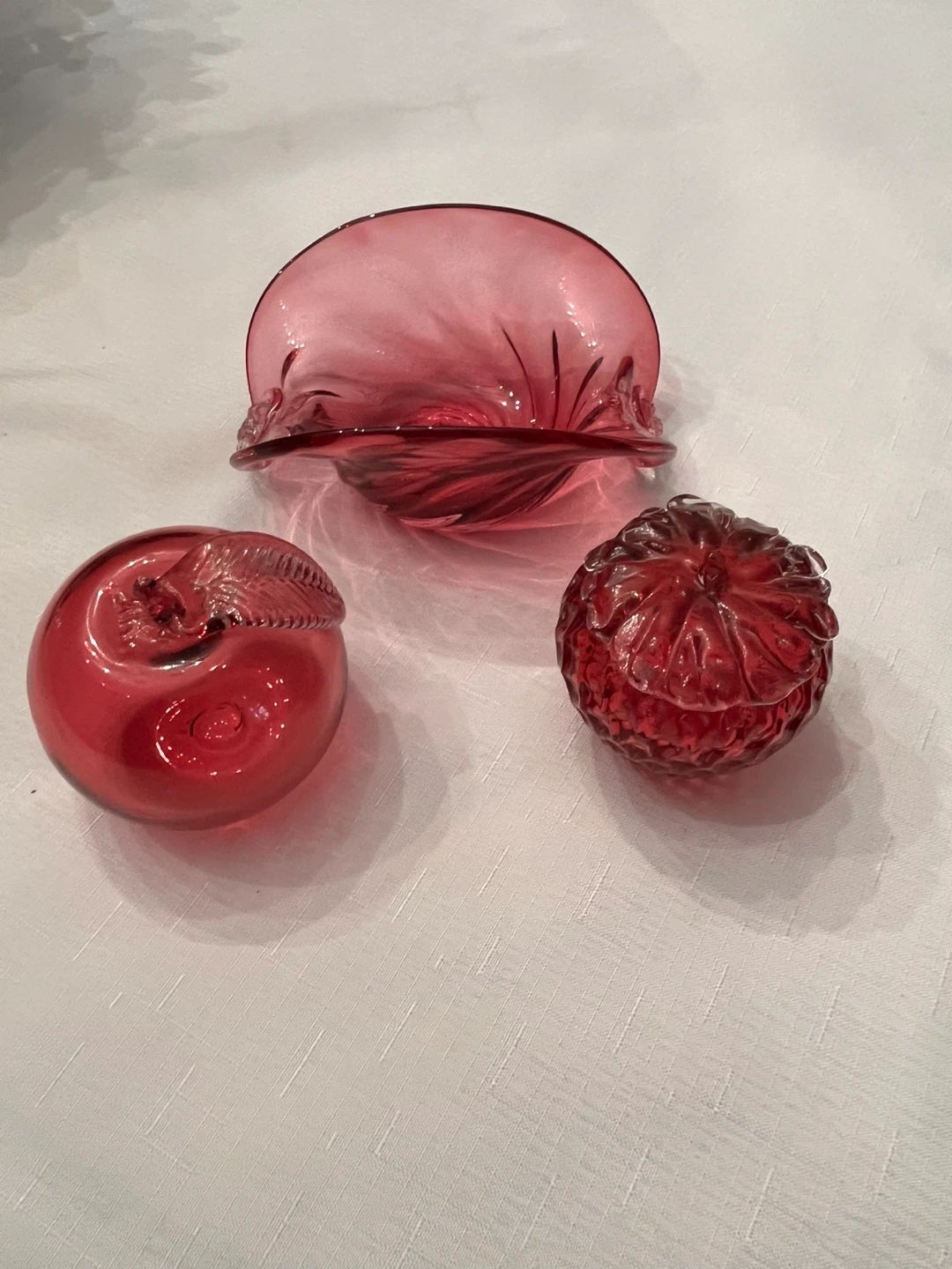 Selling a unique cranberryglass bowl with a beautiful swirl design. It's in great condition and would look lovely as a decorative piece in any room. Also is a cranberry apple and strawberry. Excellent condition, smoke free home