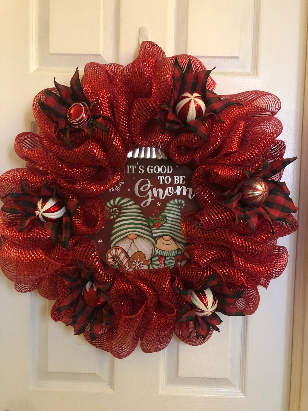 This is a festive red Christmas wreath featuring gnomes! It's perfect for adding a touch of holiday cheer to your door or wall. The wreath is adorned with red mesh, plaid ribbons, and decorative ornaments.
