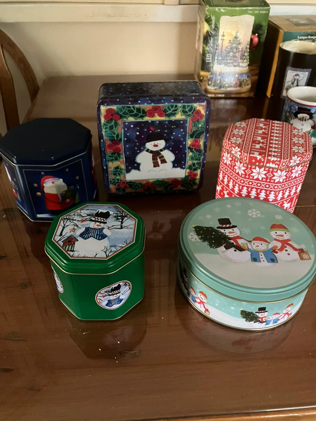 Selling a collection of festive Christmas tins and mugs. Perfect for adding a touch of holiday cheer to your home! The tins are great for storing treats or decorations, and the mugs are ideal for enjoying a warm beverage on a cold winter day $5 for 3 mugs &5 for the tins. Tins are new never used.