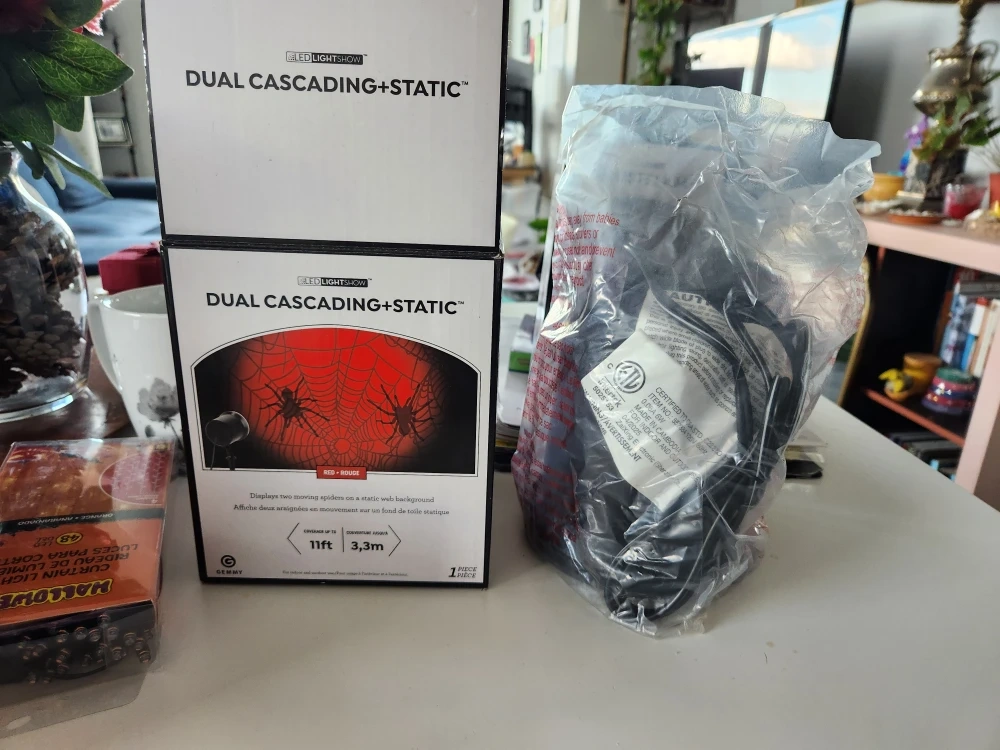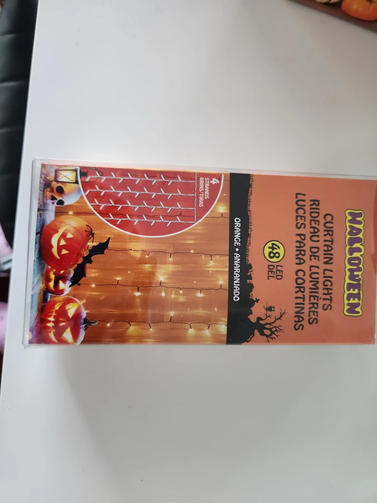 Get ready for Halloween with these fun decorations! I have Globe Midnight Web string lights, featuring a 39" diameter web. Also included are Halloween curtain lights with 48 LEDs. Both are brand new in their original packaging!